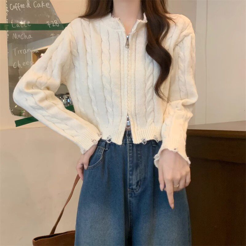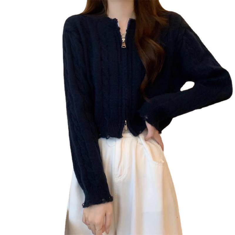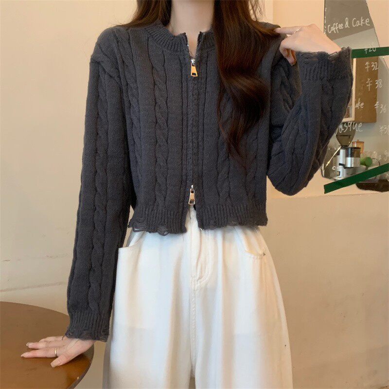 2026新款设计感双拉链麻花毛衣外套女款秋冬韩系纯色短款针织开衫