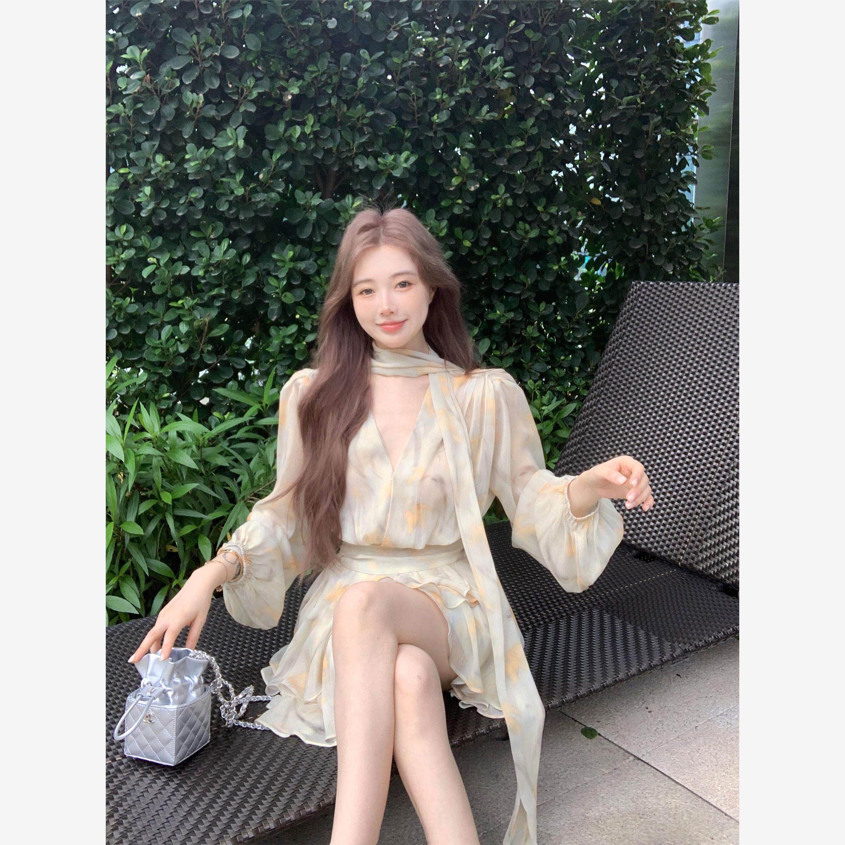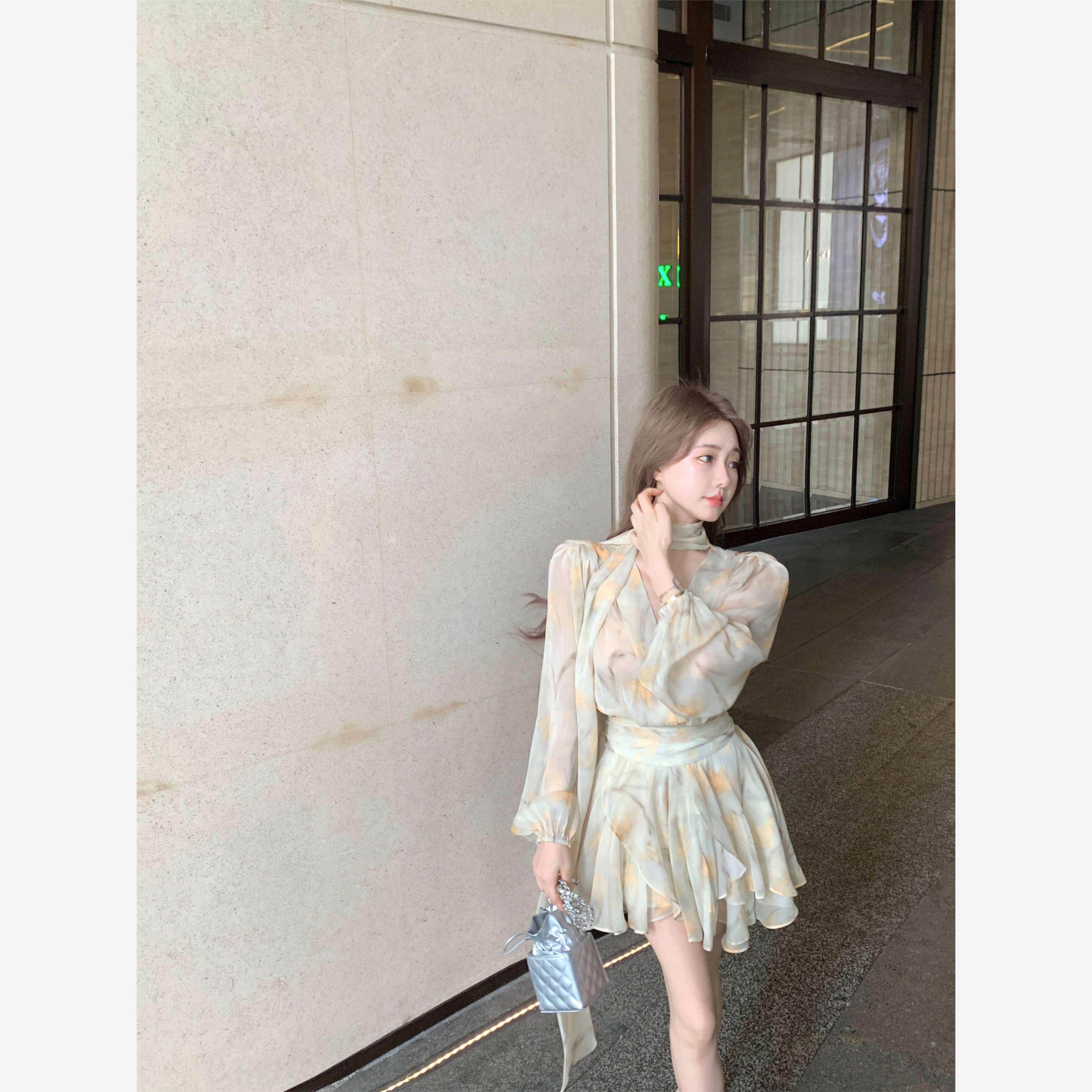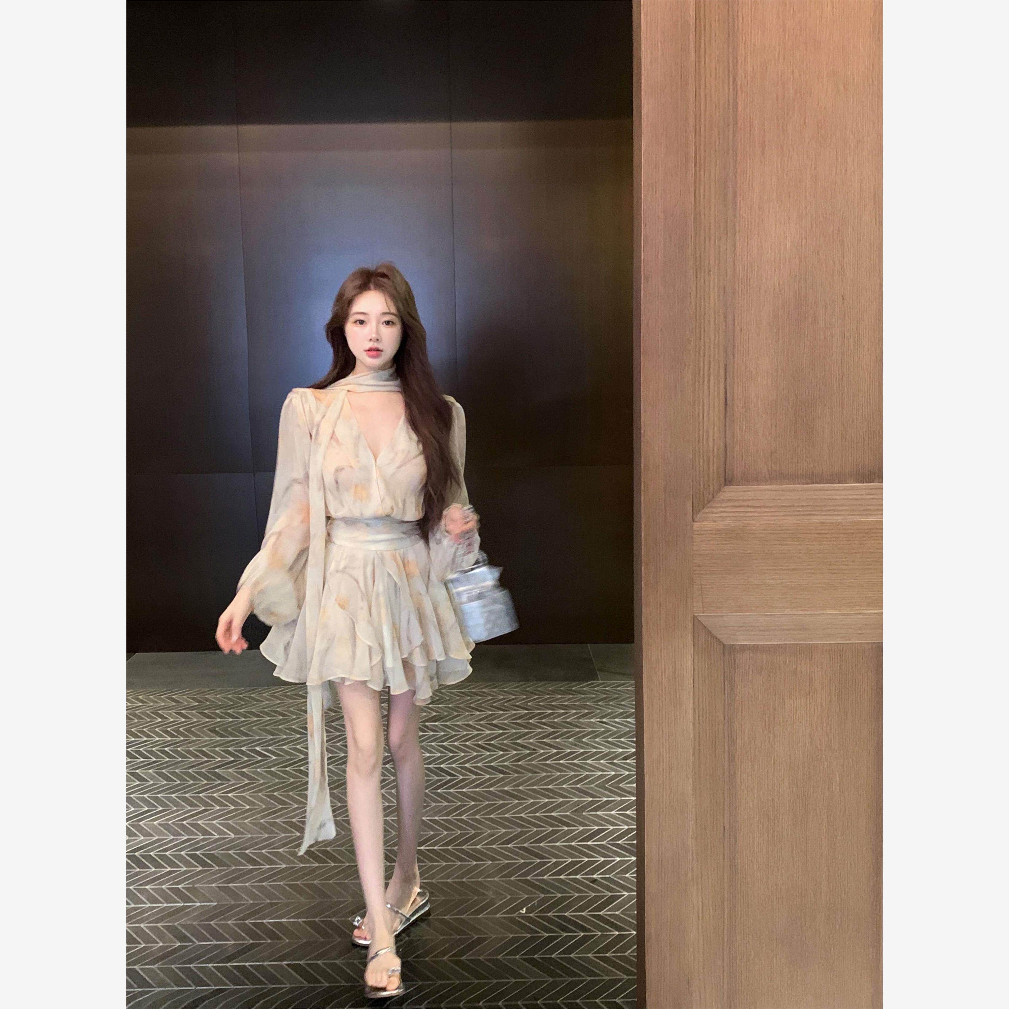 法式碎花v领长袖雪纺连衣裙女夏季温柔风设计感别致收腰a字短裙子