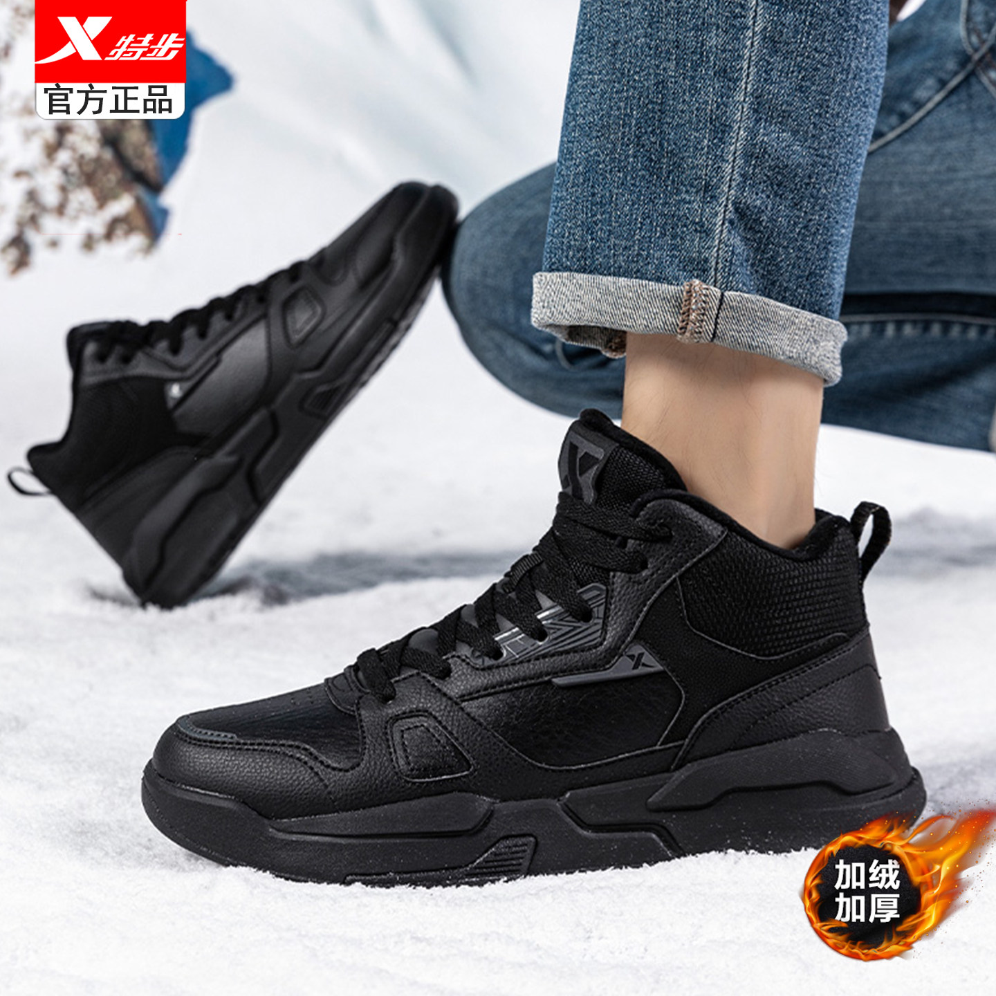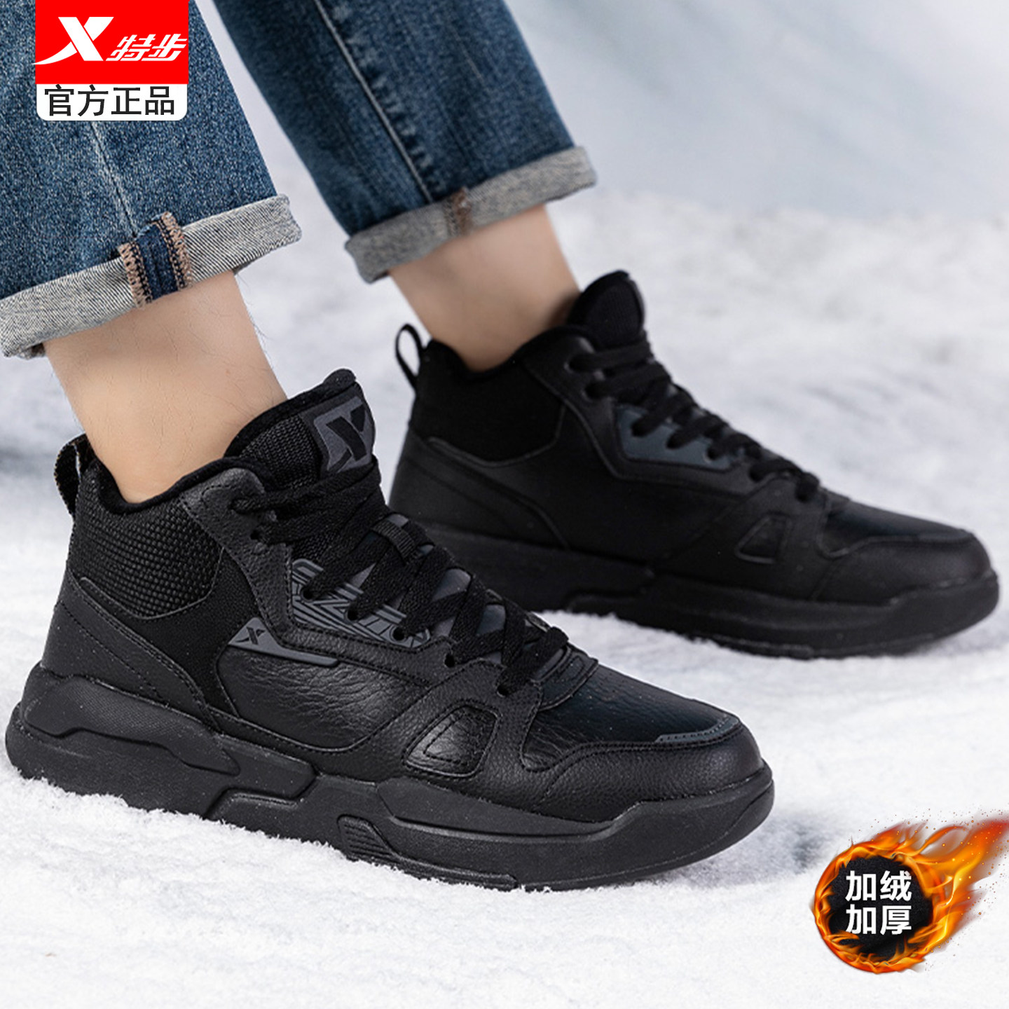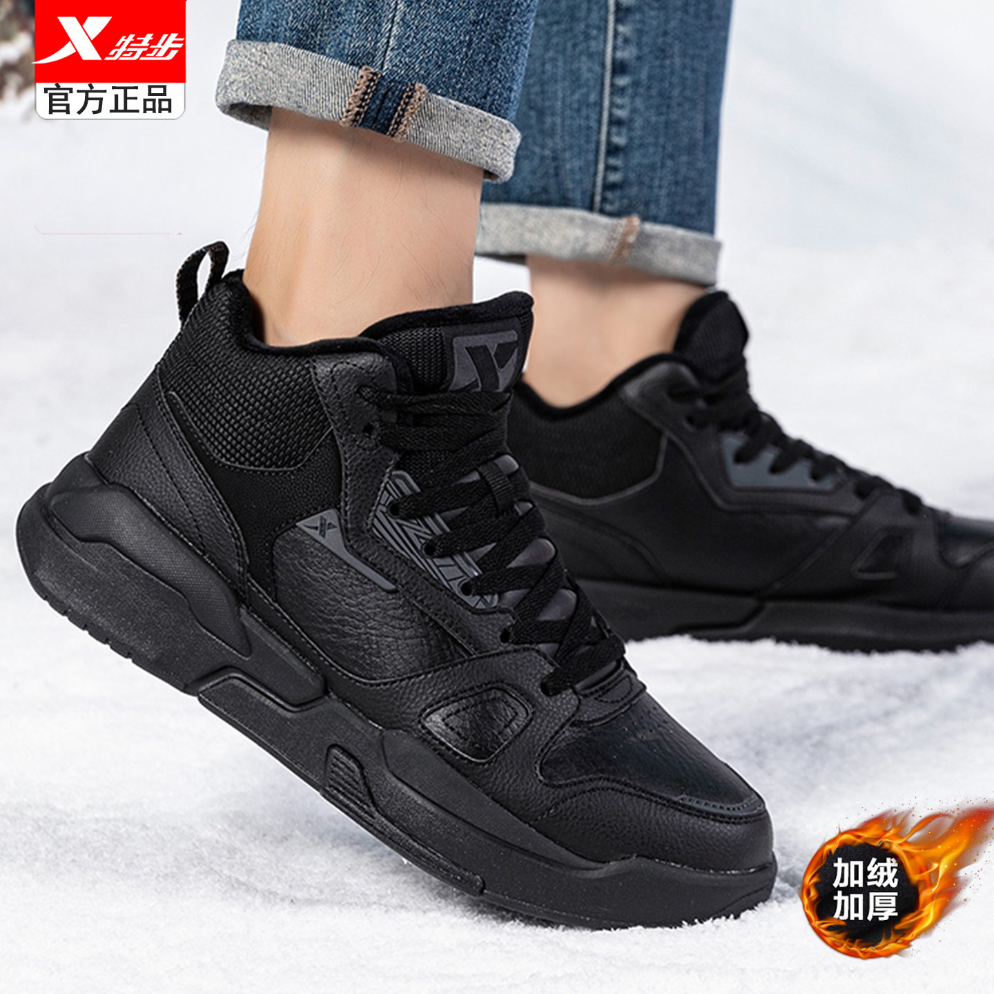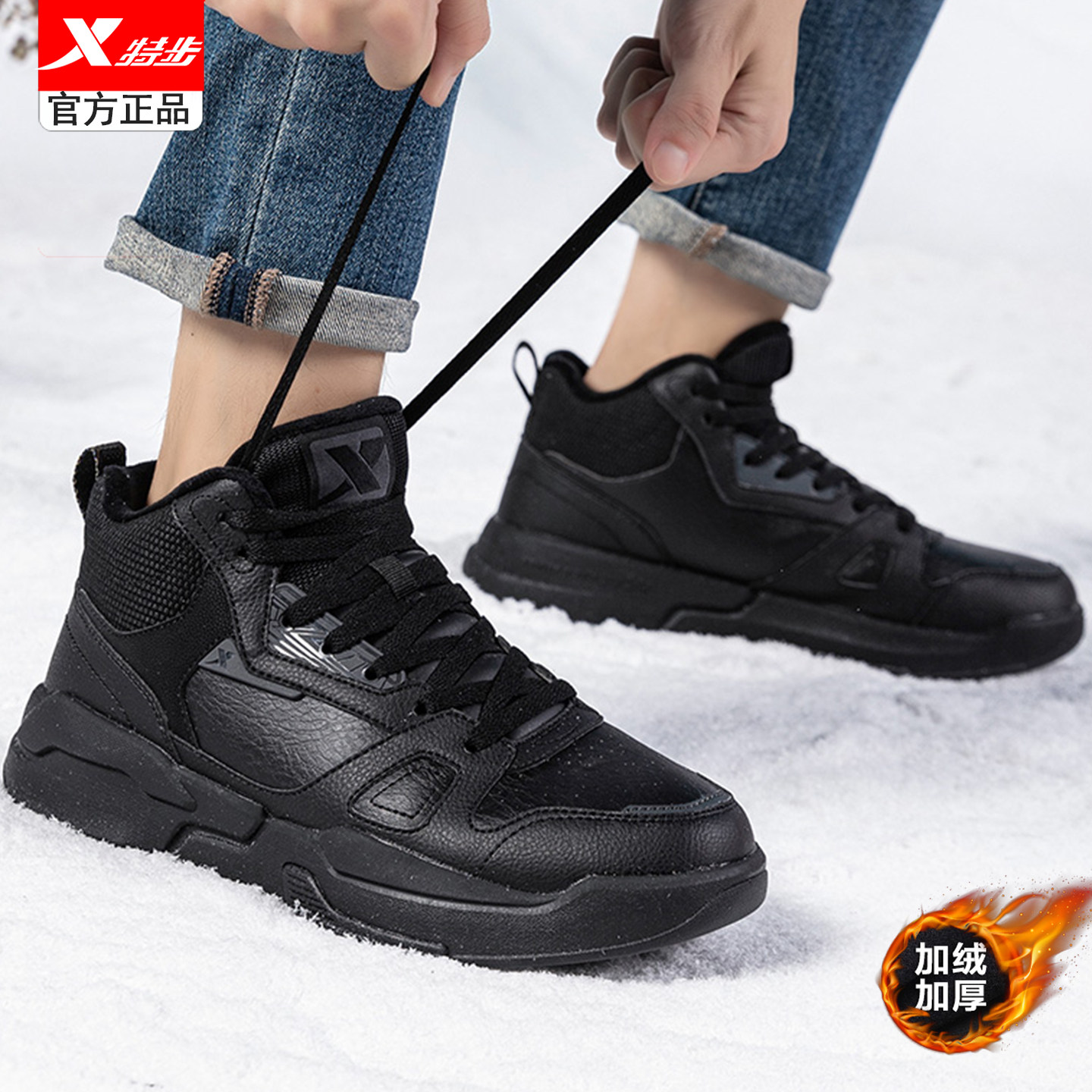 特步男鞋休闲鞋冬季新款加绒保暖棉鞋官方正品高帮板鞋运动鞋男鞋
