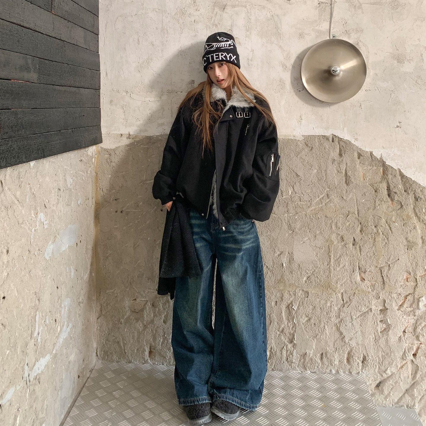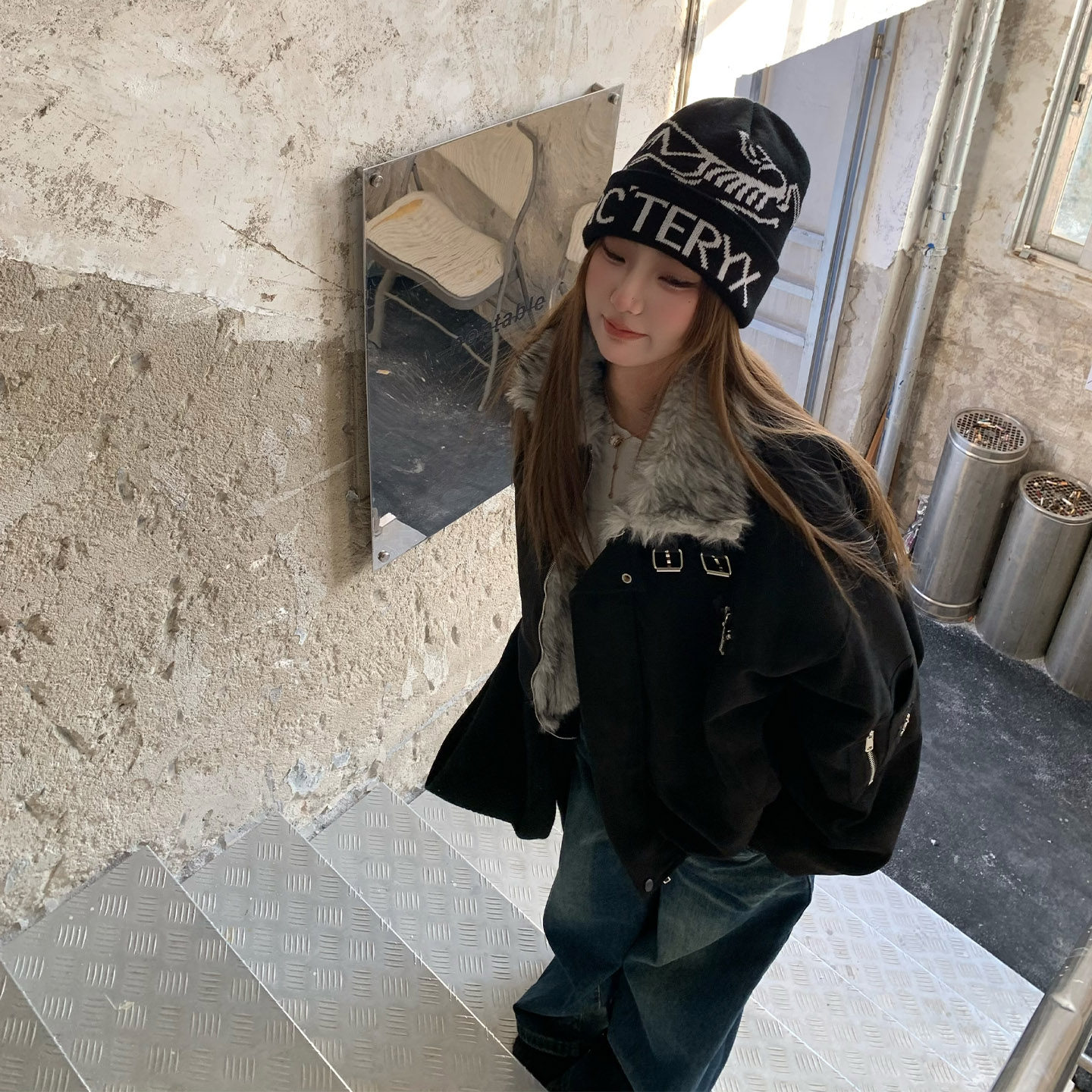 饭饭又饿了美式毛领棉服外套冬季女款夹棉保暖高级感宽松机车夹克