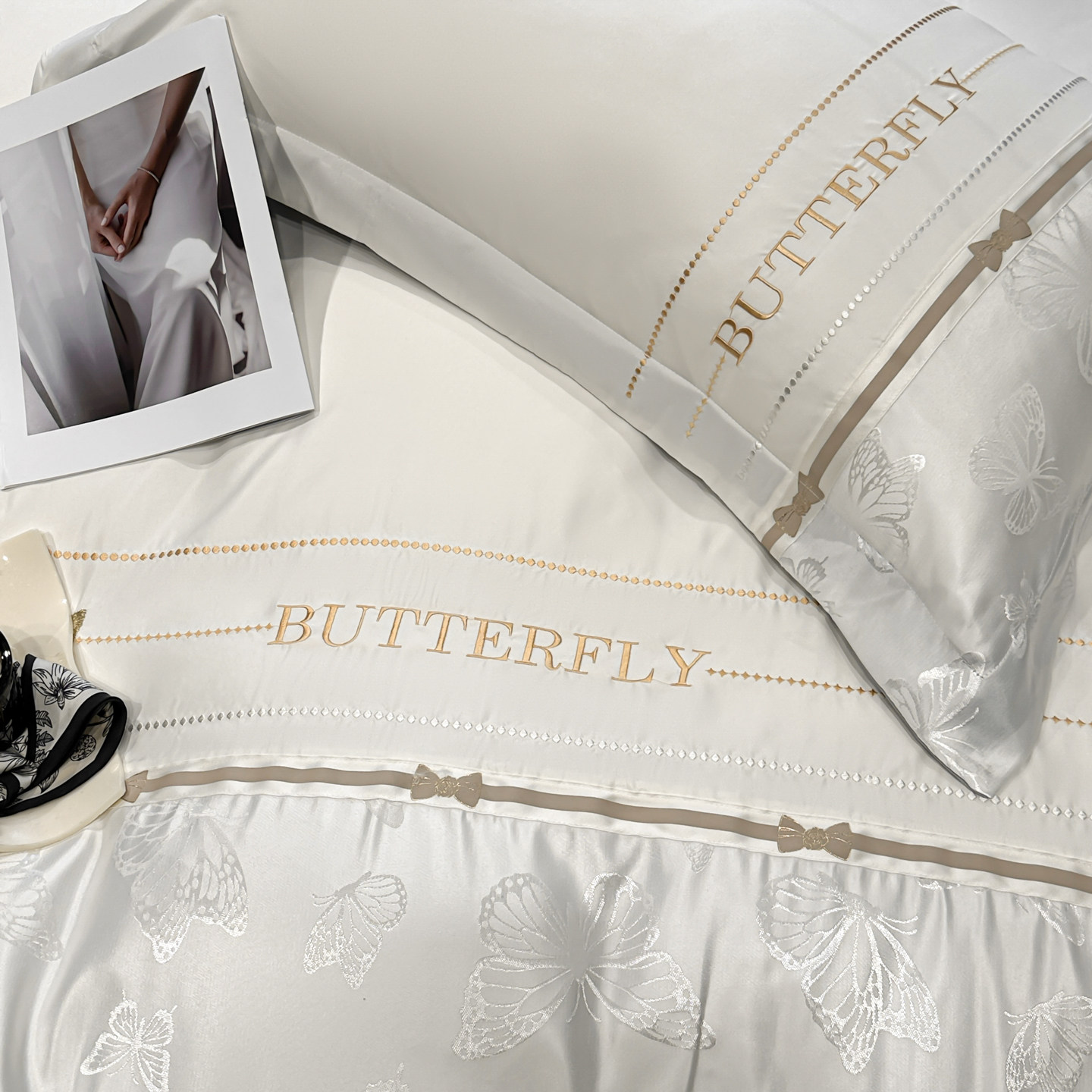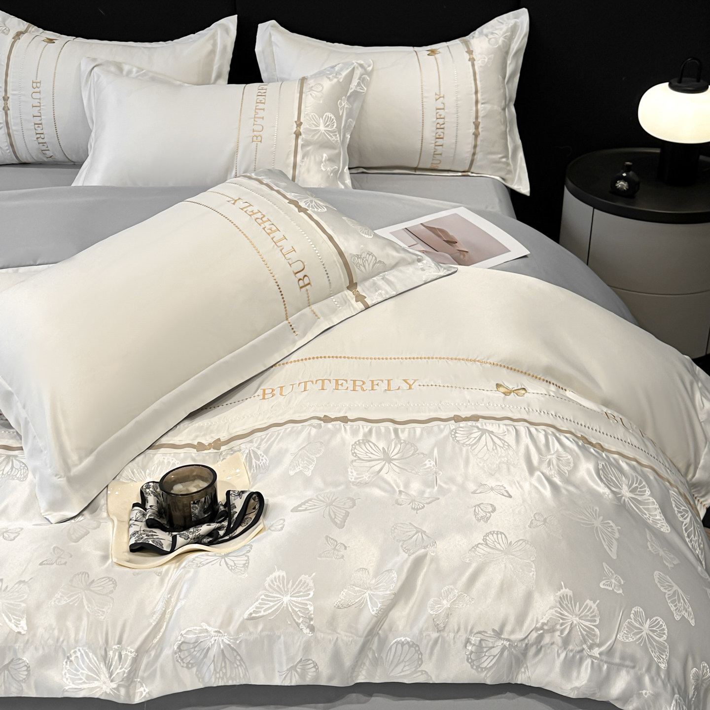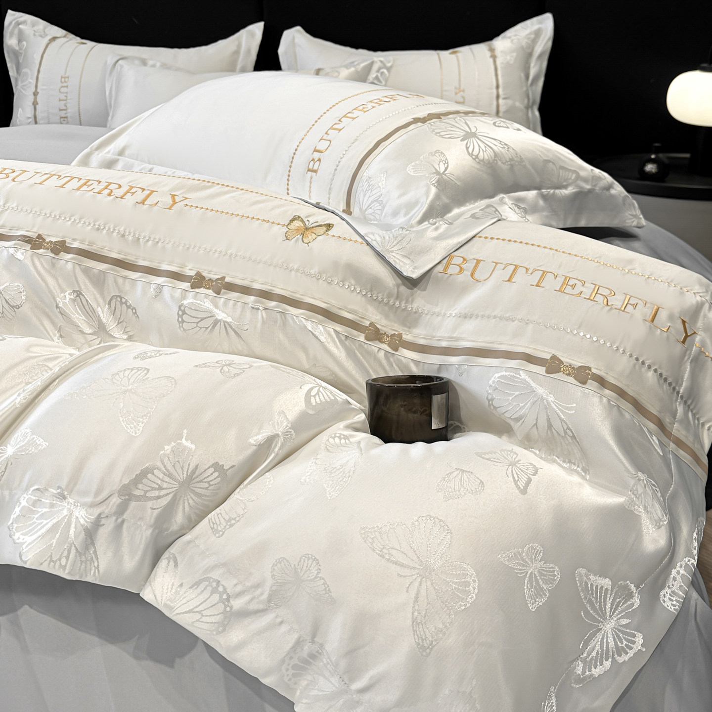 夏季双拼色贡缎提花冰丝四件套2026新款真丝蝴蝶刺绣被套床单床笠