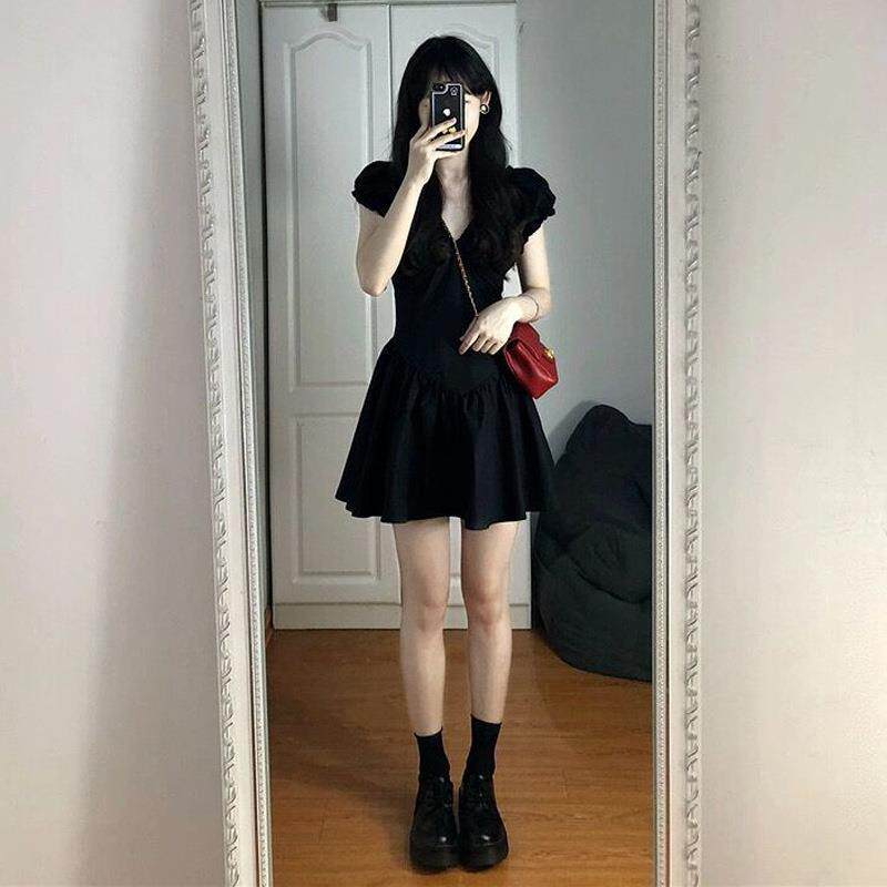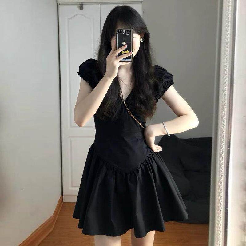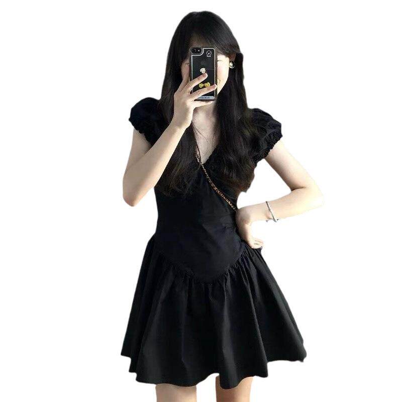 黑色字收腰显瘦短款海边连衣裙子女夏季女装新款领气质短裙