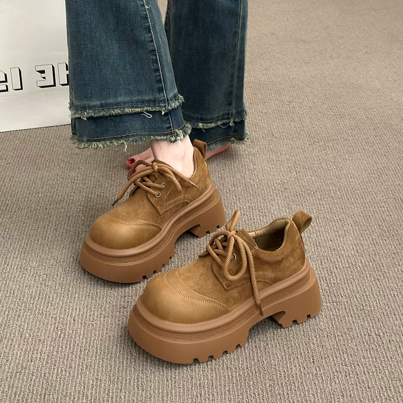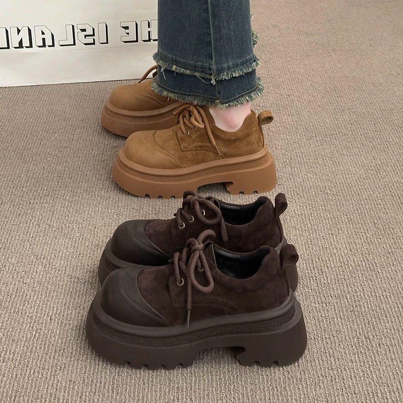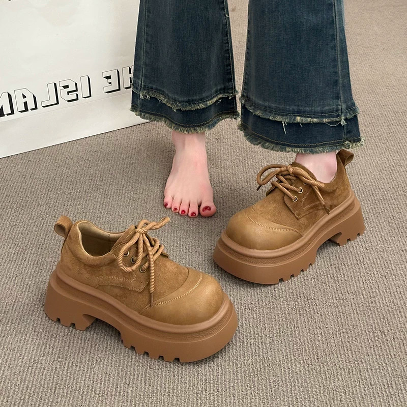 2026早春磨砂皮英伦风厚底乐福鞋女系带圆头百搭增高鞋松糕鞋女