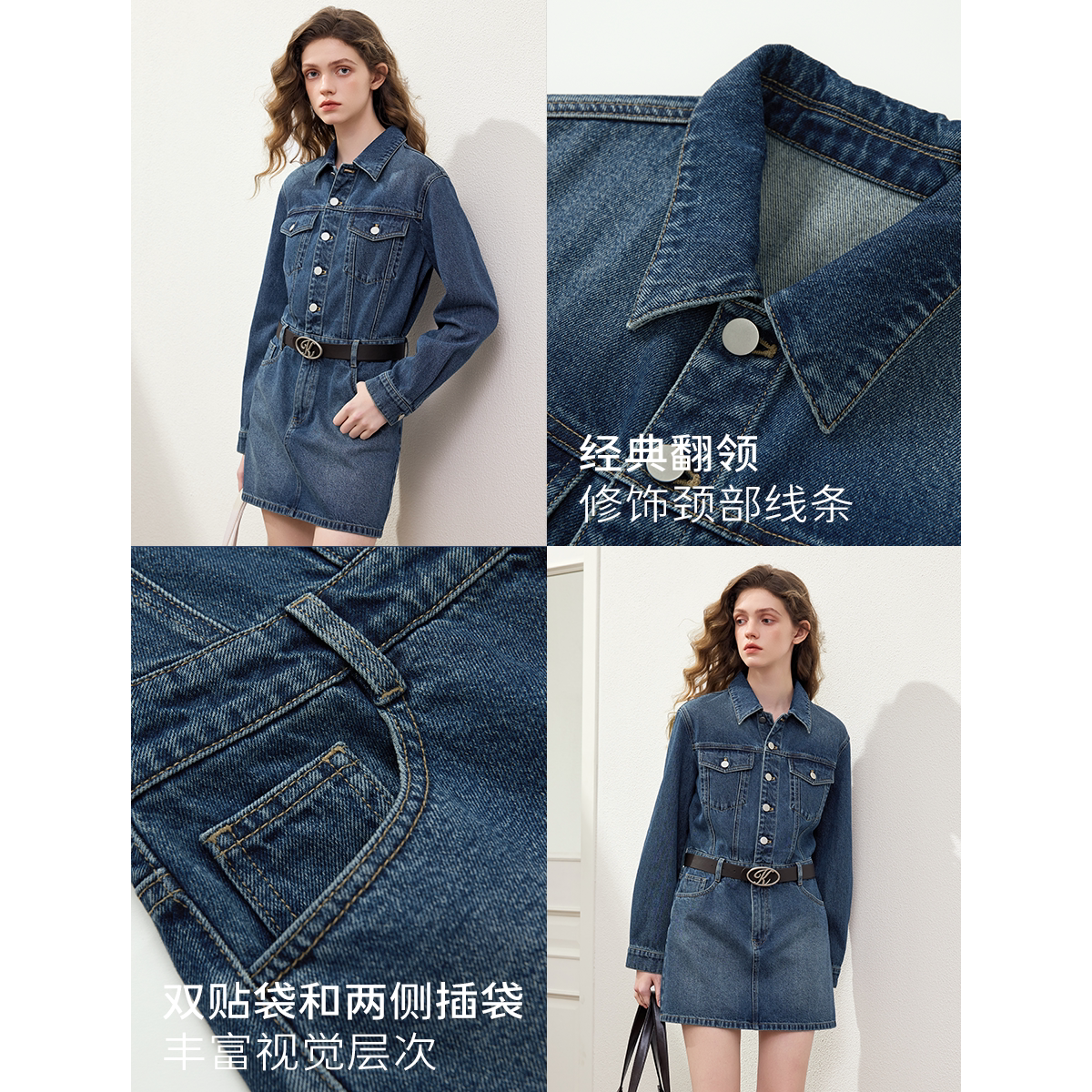 KBNE小个子纯棉翻领法式牛仔连衣裙女2026春季新款长袖收腰显瘦裙