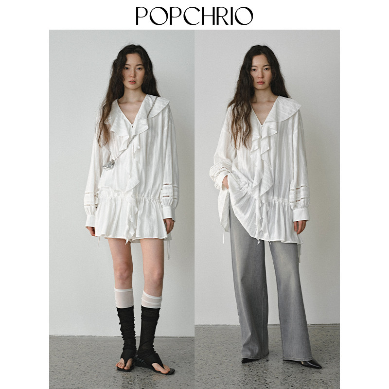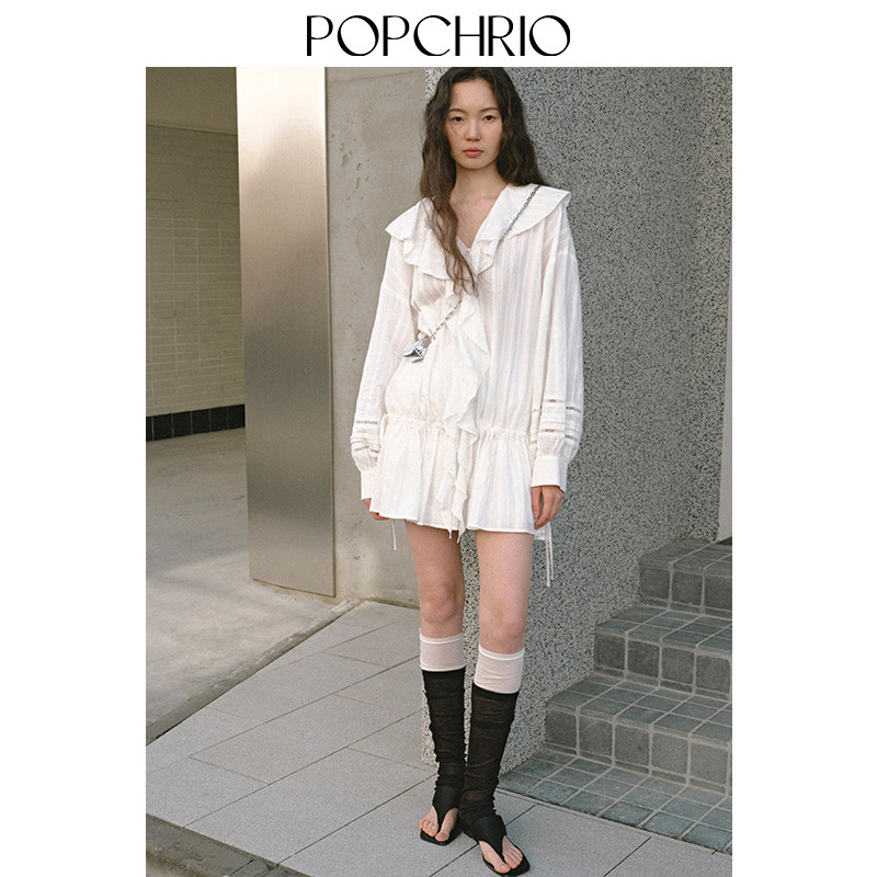 POPCHRIO欧可芮◆法式荷叶边蕾丝长袖衬衫连衣裙V领叠穿显瘦裙子