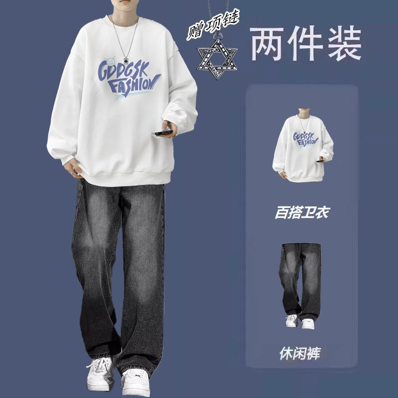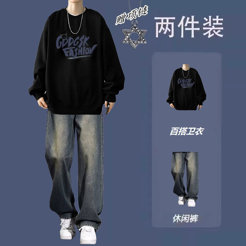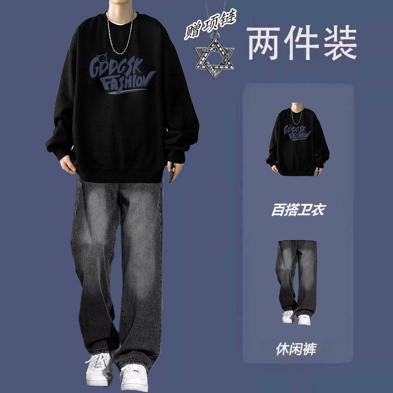 卫衣男款秋套装青少年搭配高街牛仔裤一套潮酷帅穿搭休闲两件套