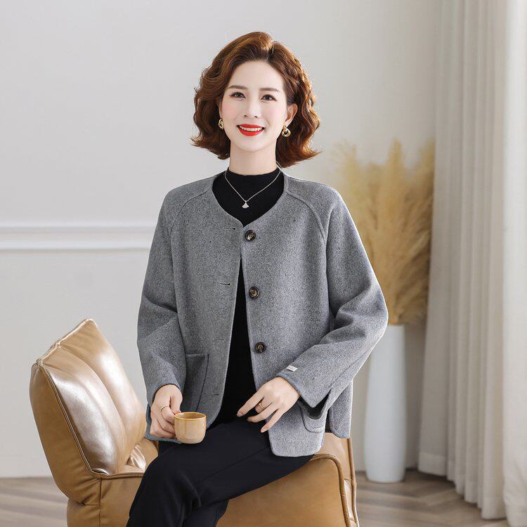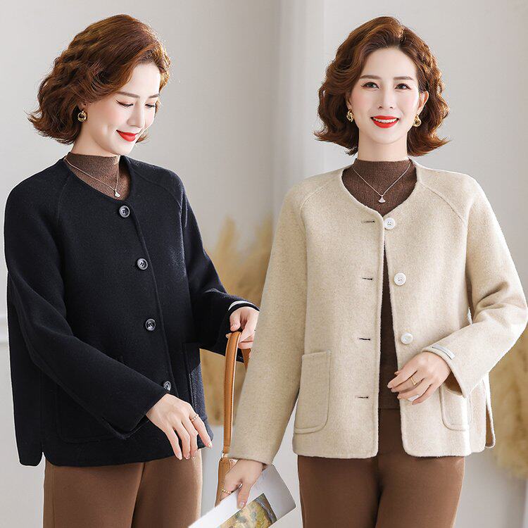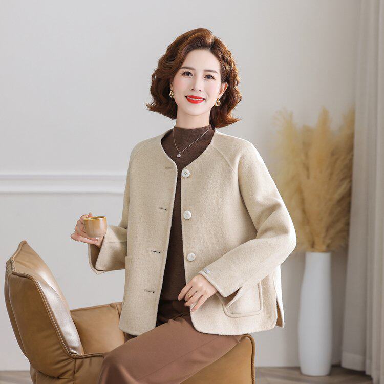 妈妈秋季时尚双面呢子大衣短款小个子中年女秋冬高贵洋气毛呢外套
