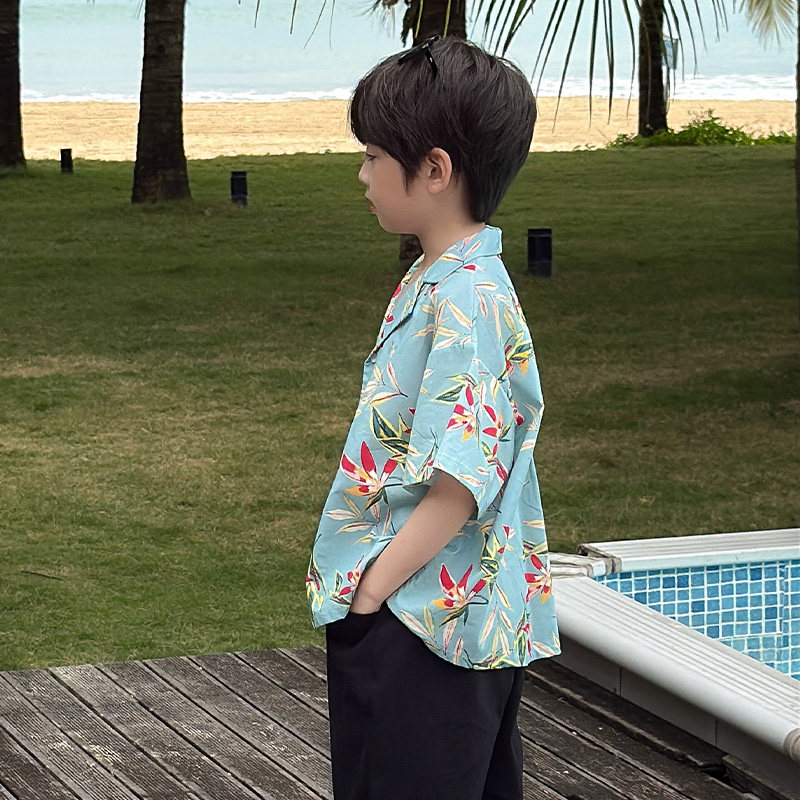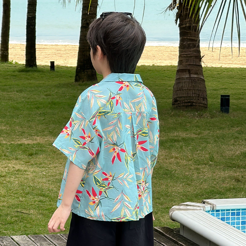 虾酱麻麻男童花衬衫短袖春夏款2026新款韩范度假风纯棉儿童装衬衣
