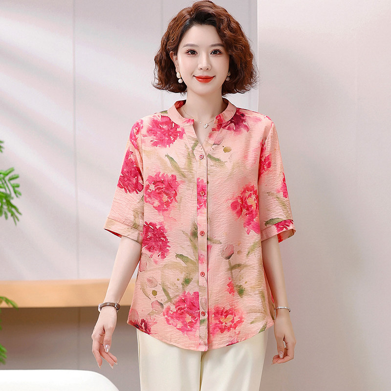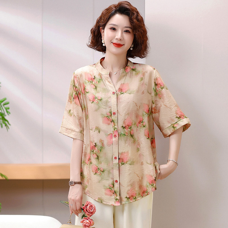 短袖衬衫女2026年新款加肥加大码夏季衬衣中老年妈妈天丝棉麻上衣