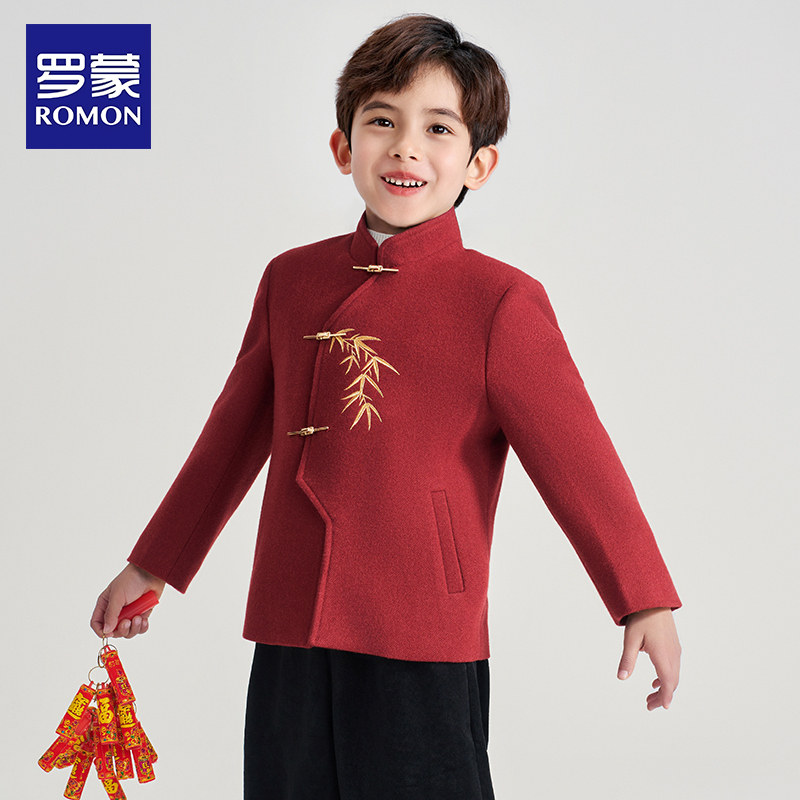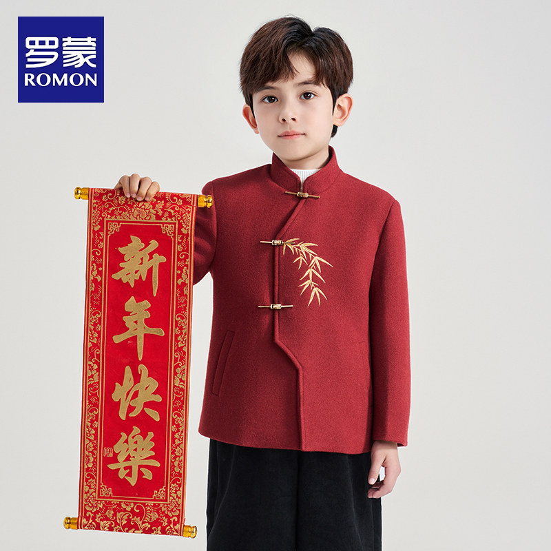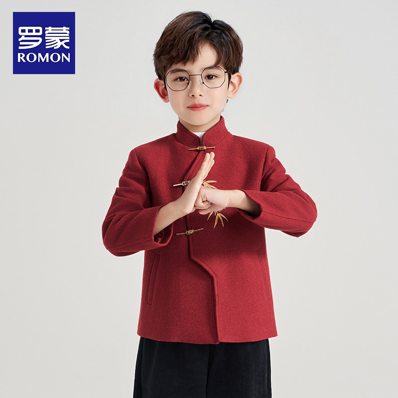 罗蒙男童毛呢外套2026秋冬新款中大童呢子上衣红色拜年服唐装棉服