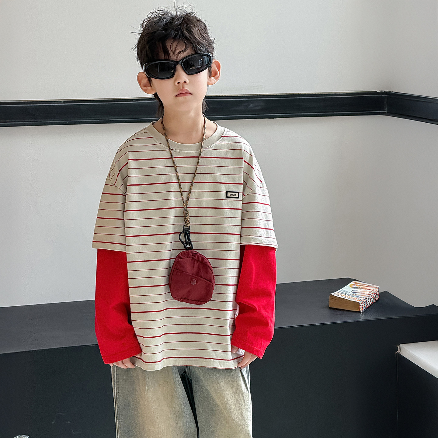男童长袖T恤春秋款2026新款春季儿童纯棉上衣男孩痞帅假两件条纹t