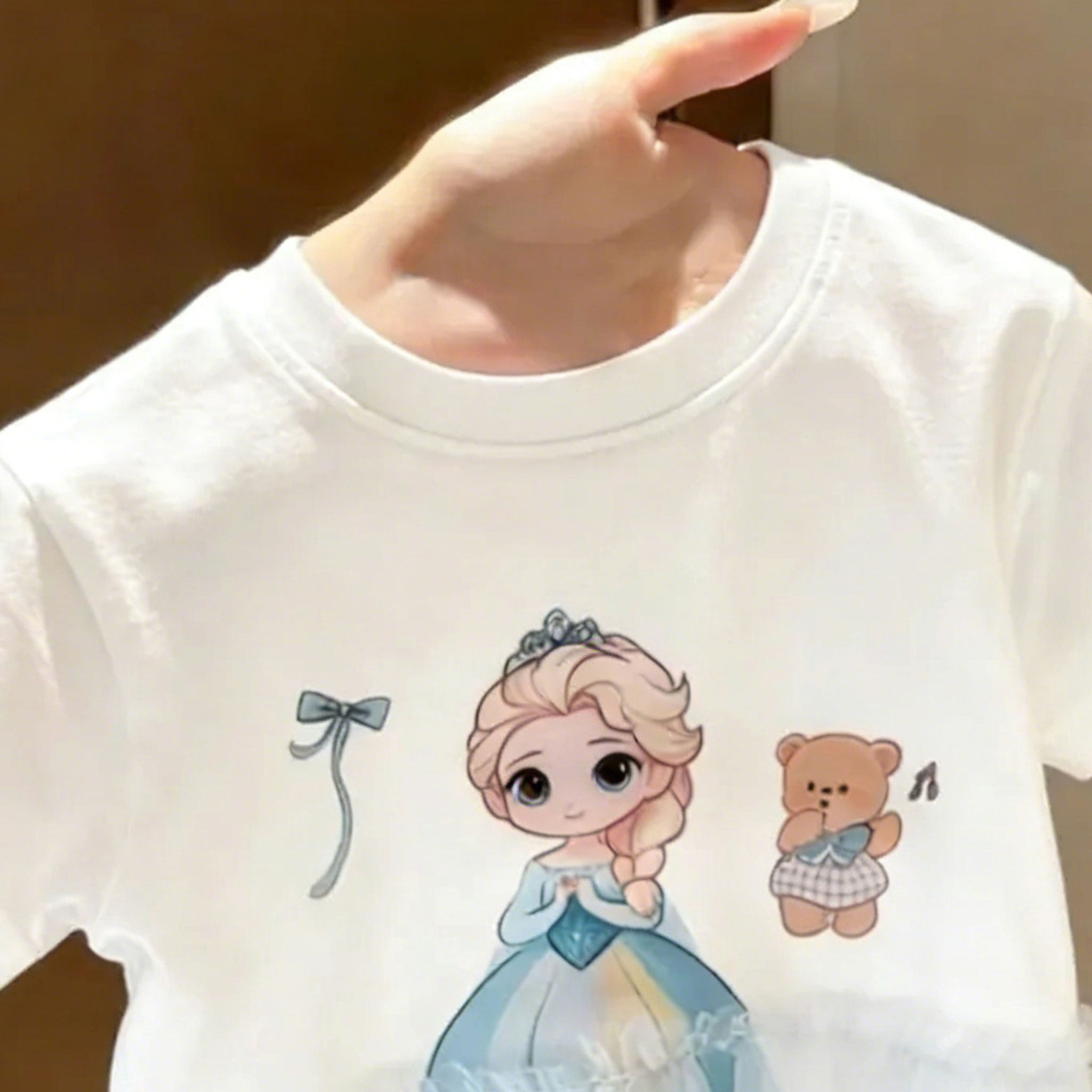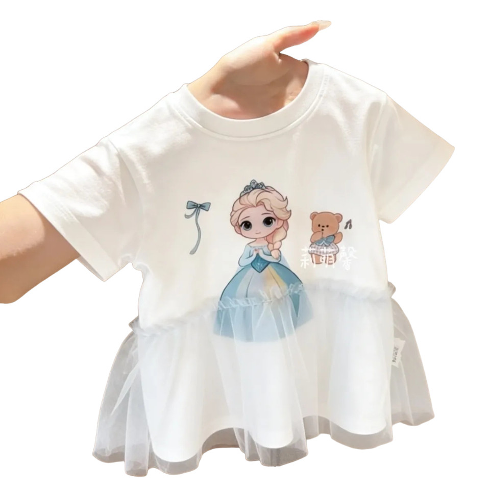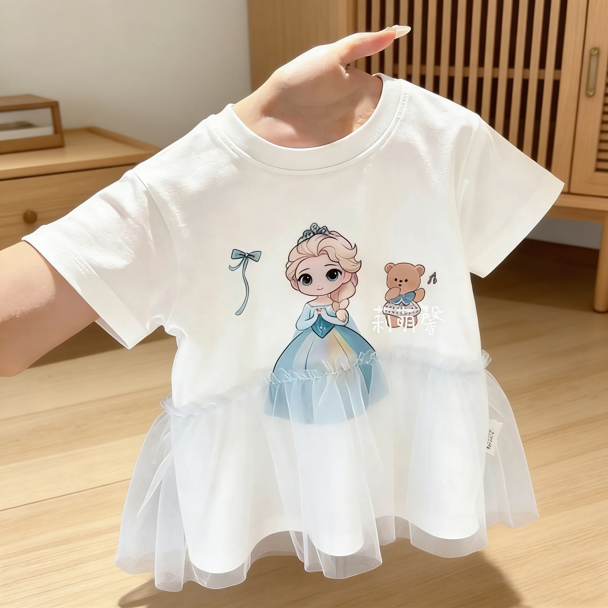 女童夏季短袖T恤爱莎卡通风网纱拼接韩版洋气薄款圆领白色上衣服