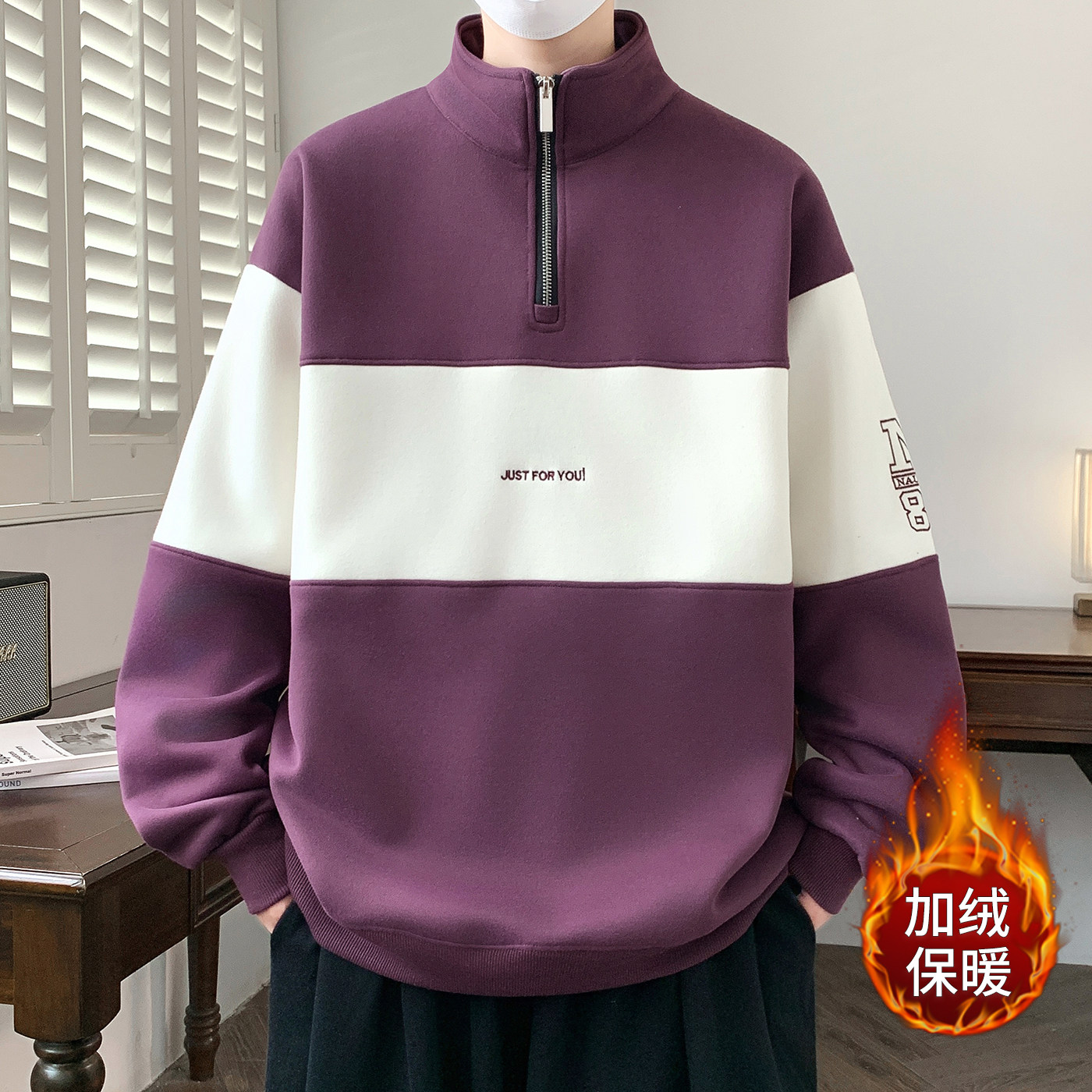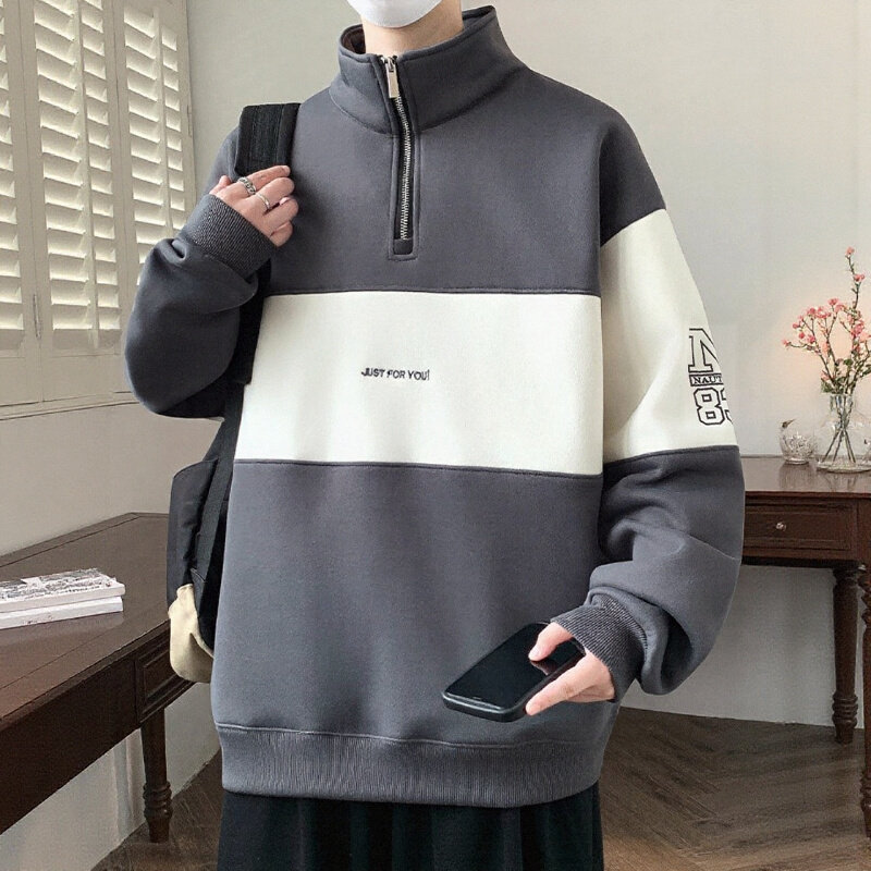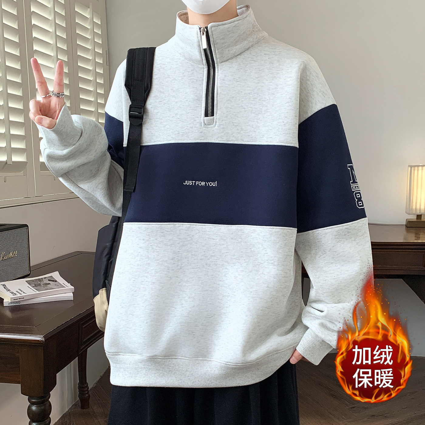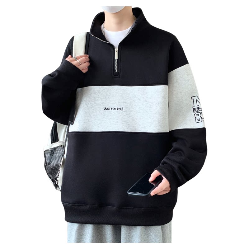 加绒立领卫衣男生秋冬季年新款加厚青少年宽松半拉链外套男装潮牌