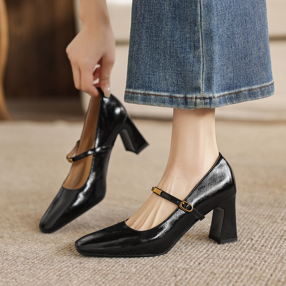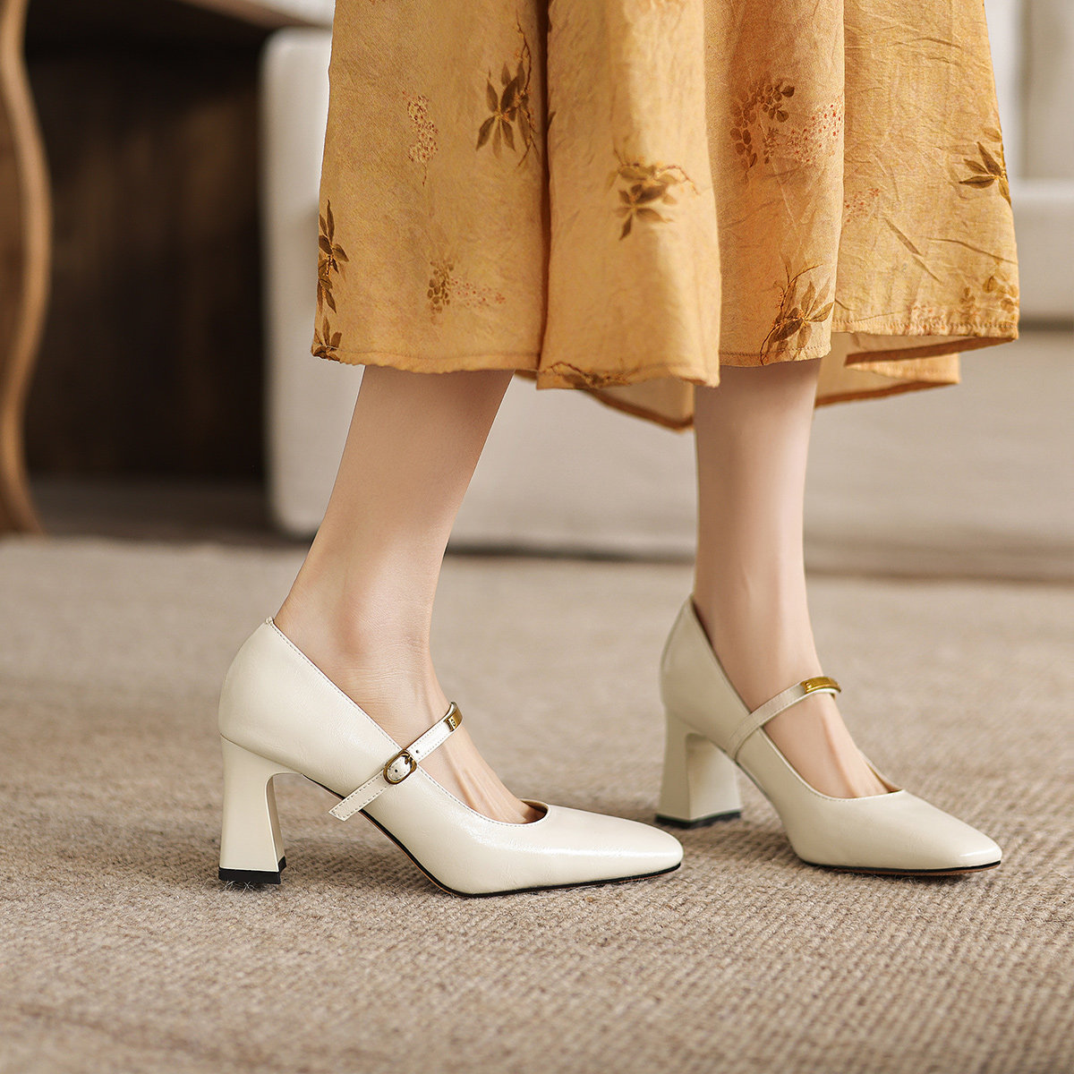 阿么手工女鞋百搭气质单鞋真皮一字带方头高跟鞋2026春季新款洋气
