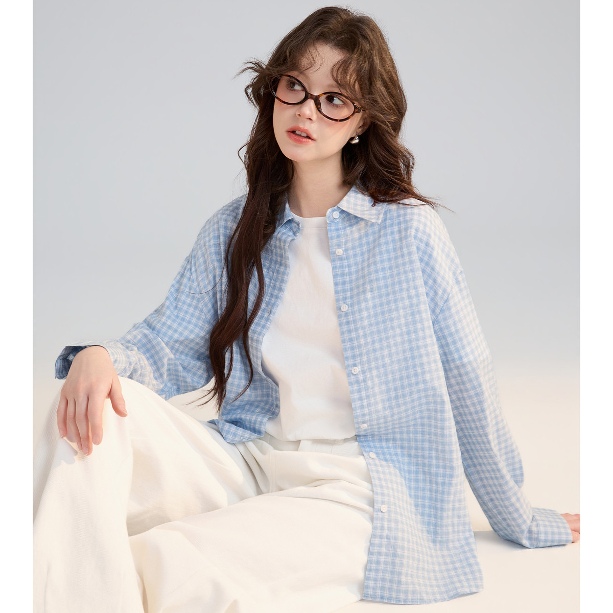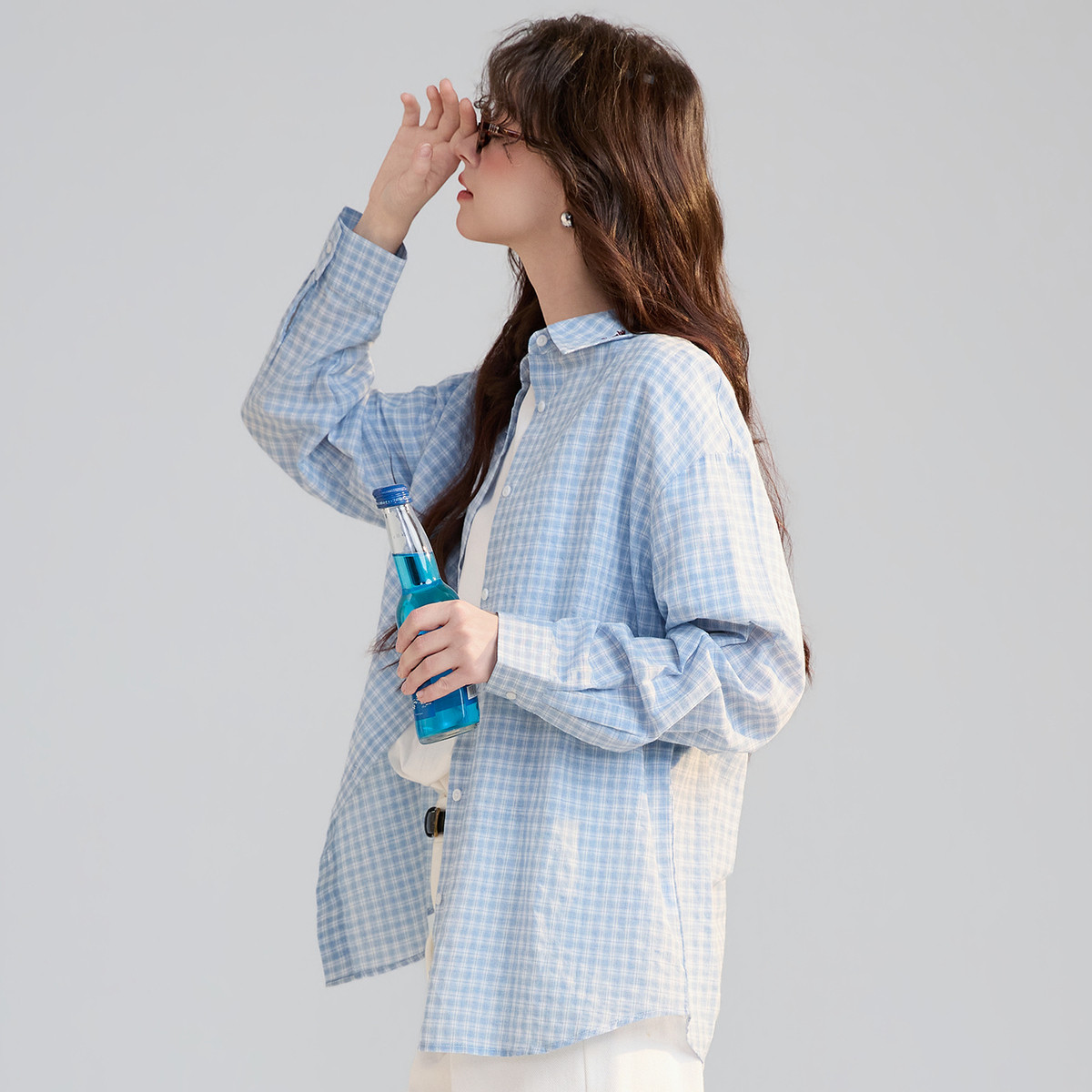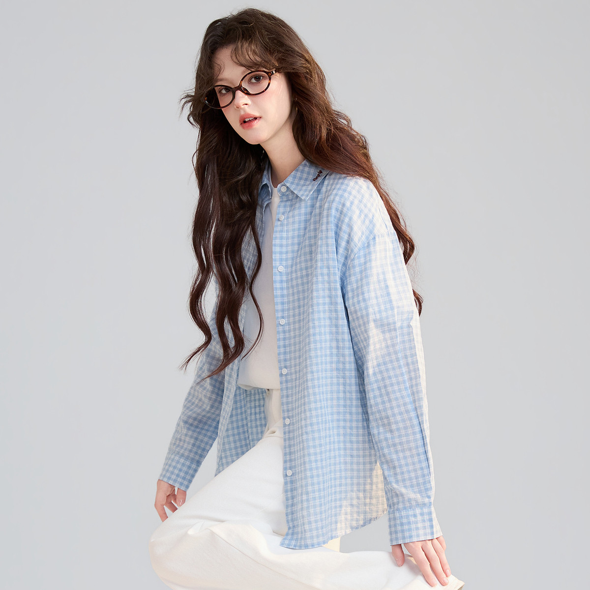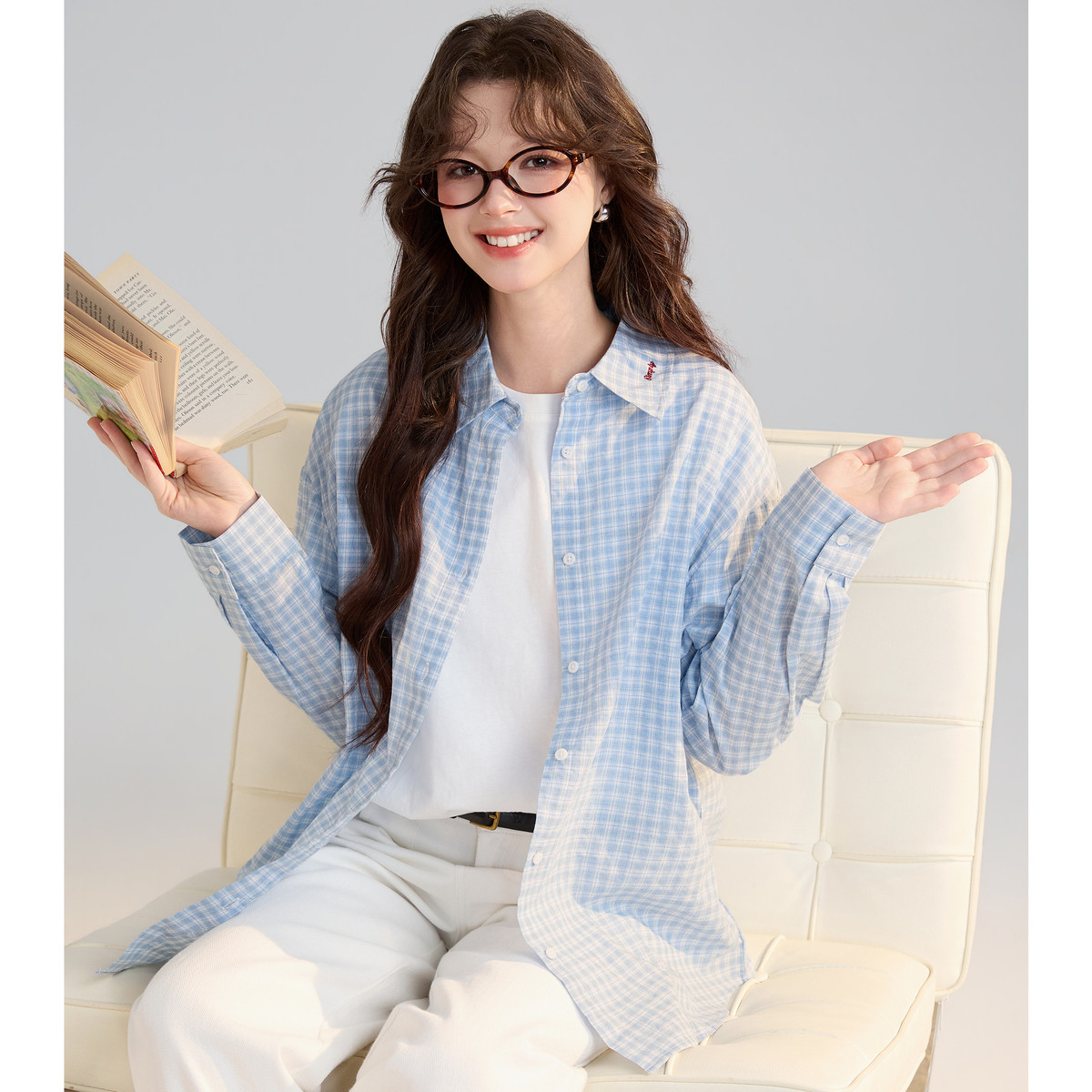 唐狮春季长袖衬衫女款2026新款蓝色格子衬衣休闲宽松衬衫外套翻领