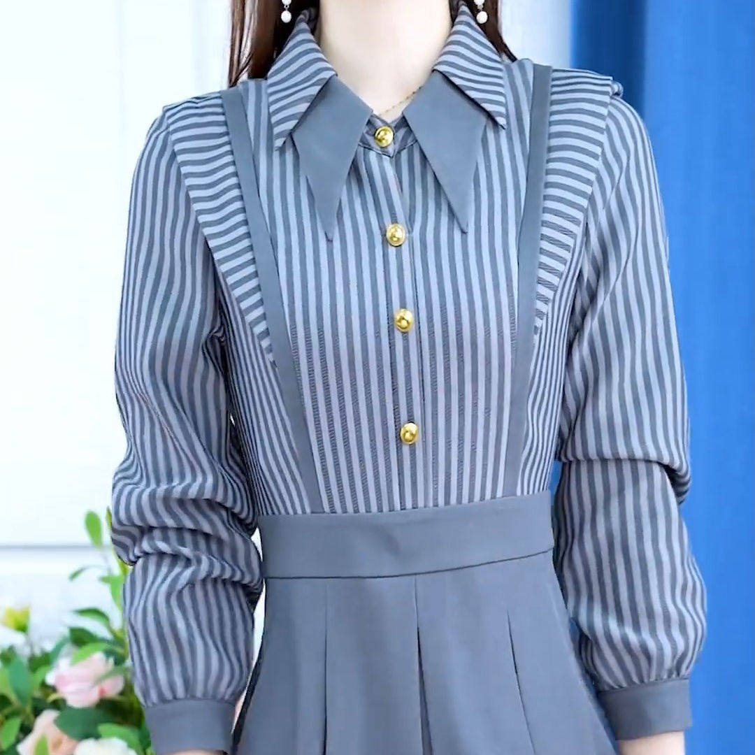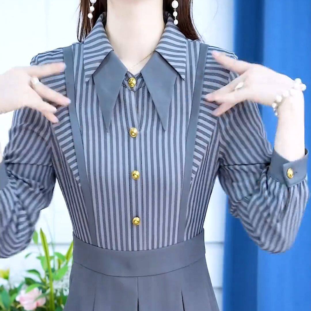311线报网描述:2024秋季新款气质显瘦条纹拼接中长款裙子