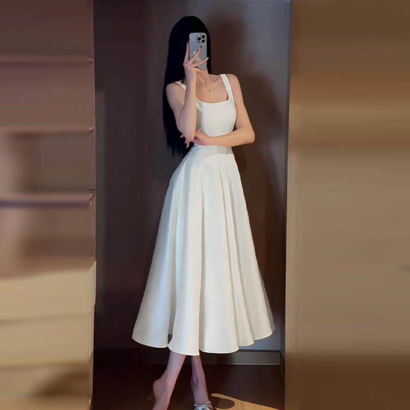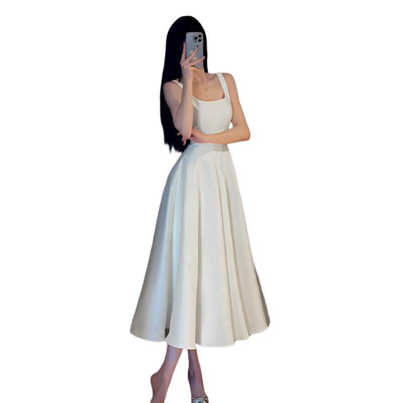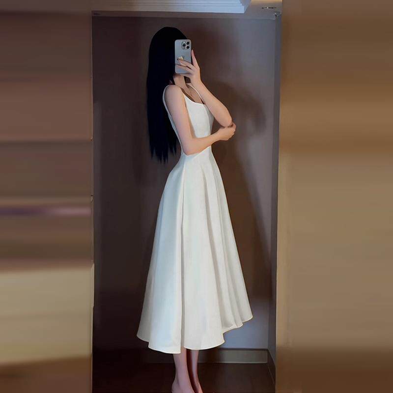 法式白色高级感吊带连衣裙子2025新款赫本风气质a字收腰长裙女夏
