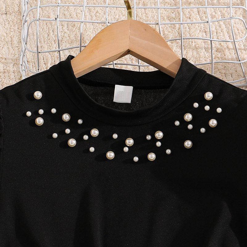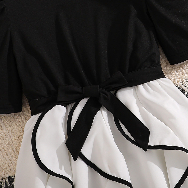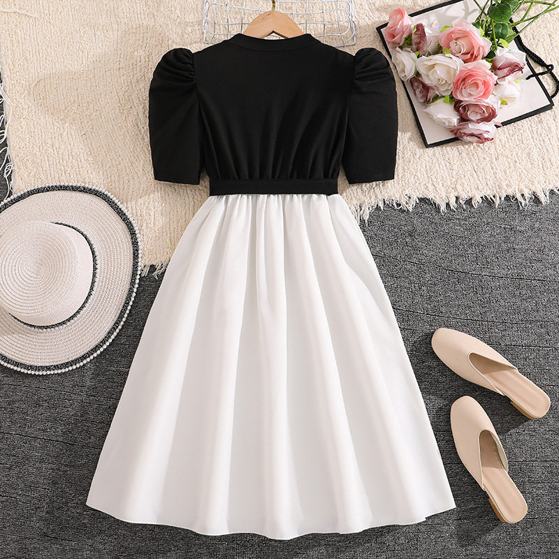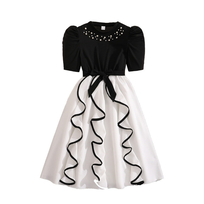 2026春夏新款大童女装可爱时尚波浪裙摆圆领泡泡袖拼接短袖连衣裙