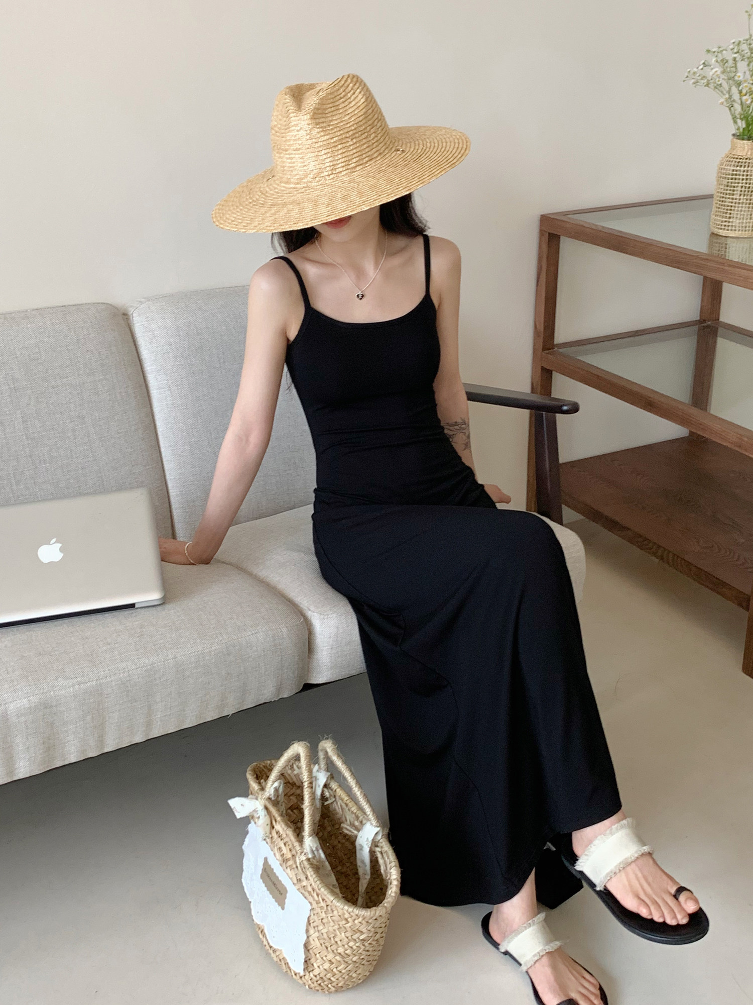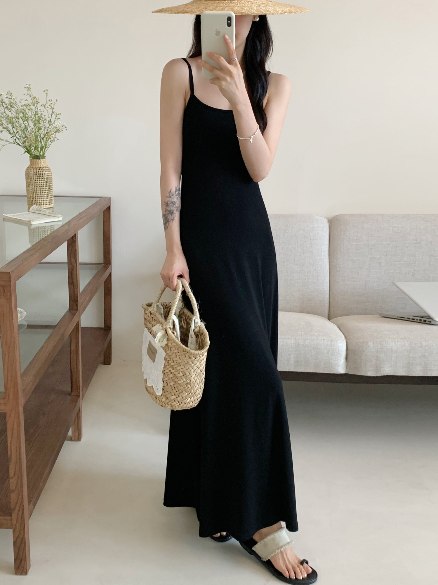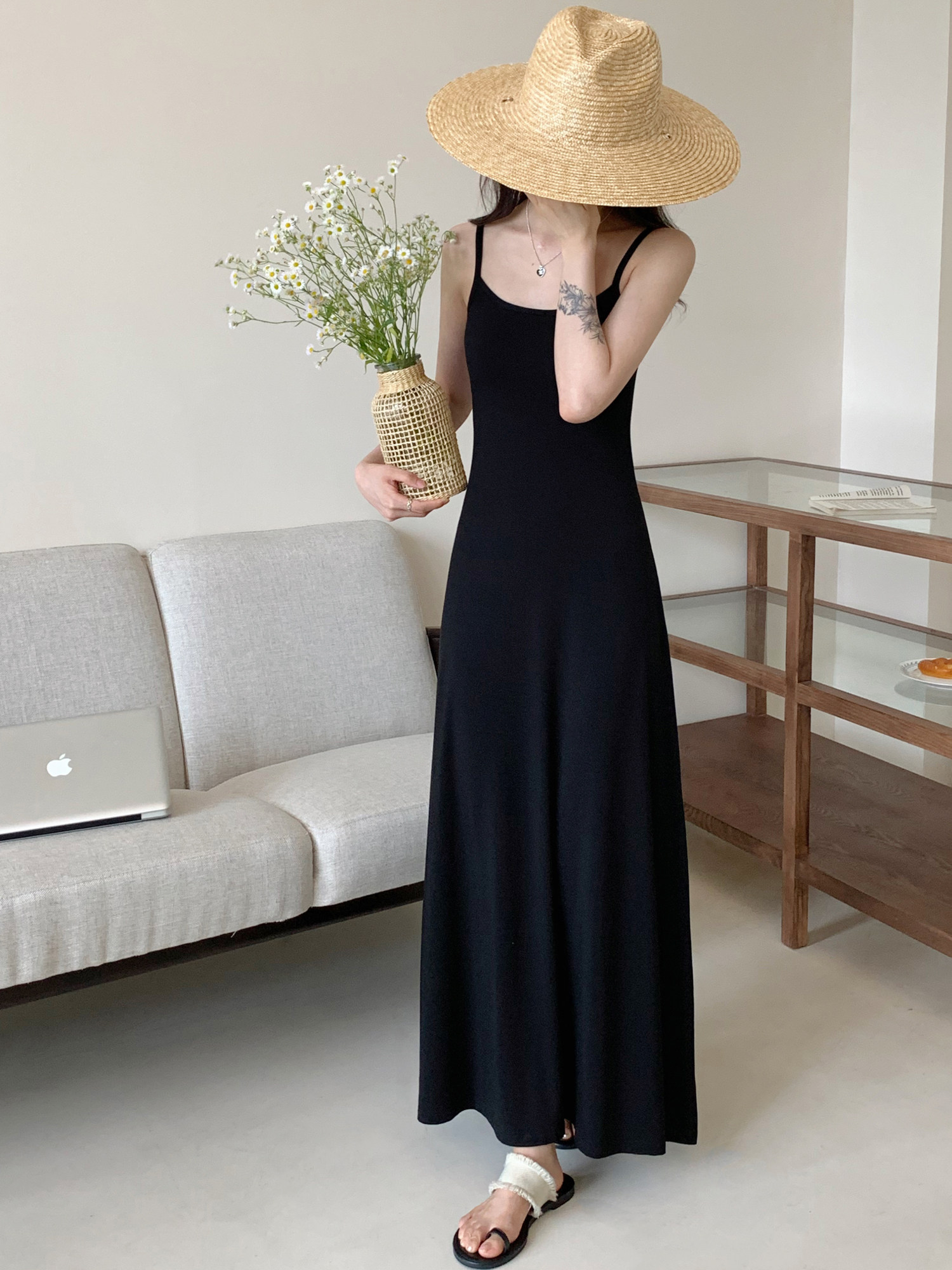 黑色莫代尔吊带连衣裙女秋修身性感收腰长裙A字裙显瘦过膝小黑裙