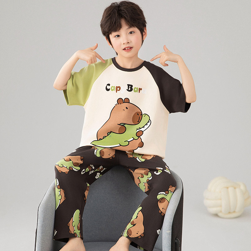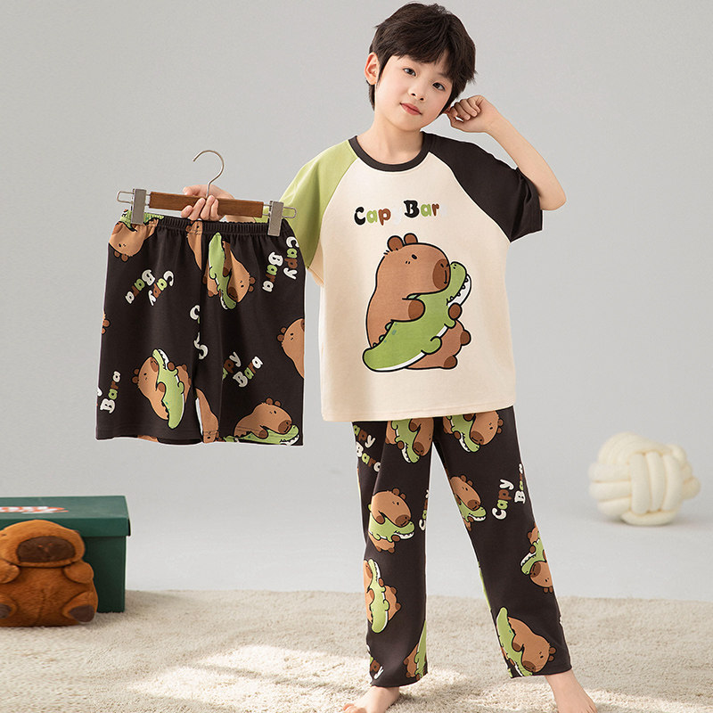 儿童睡衣男孩短袖纯棉夏季薄款搞怪卡皮巴拉卡通男童家居服三件套