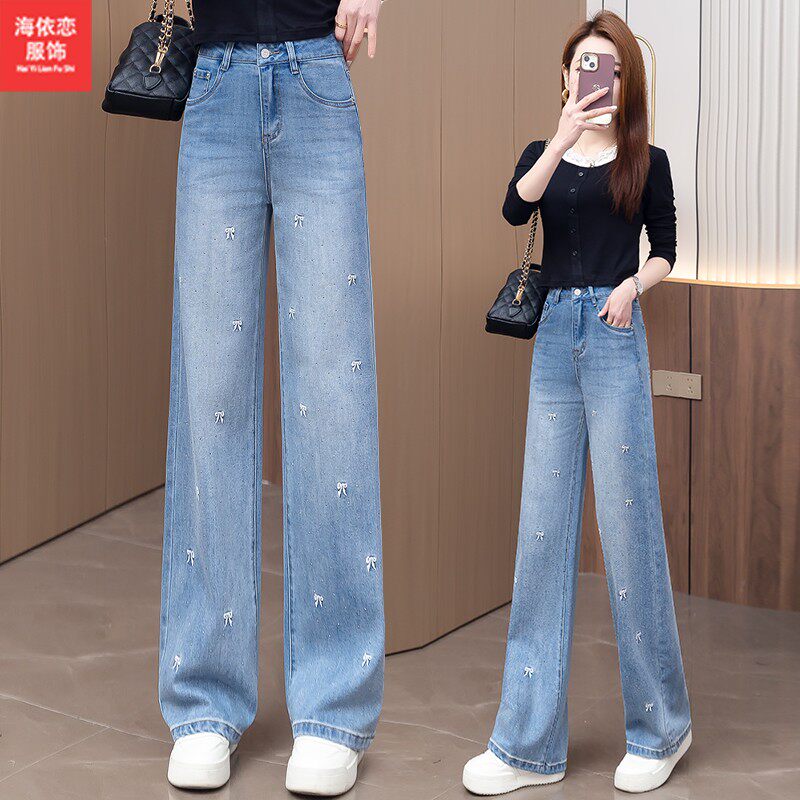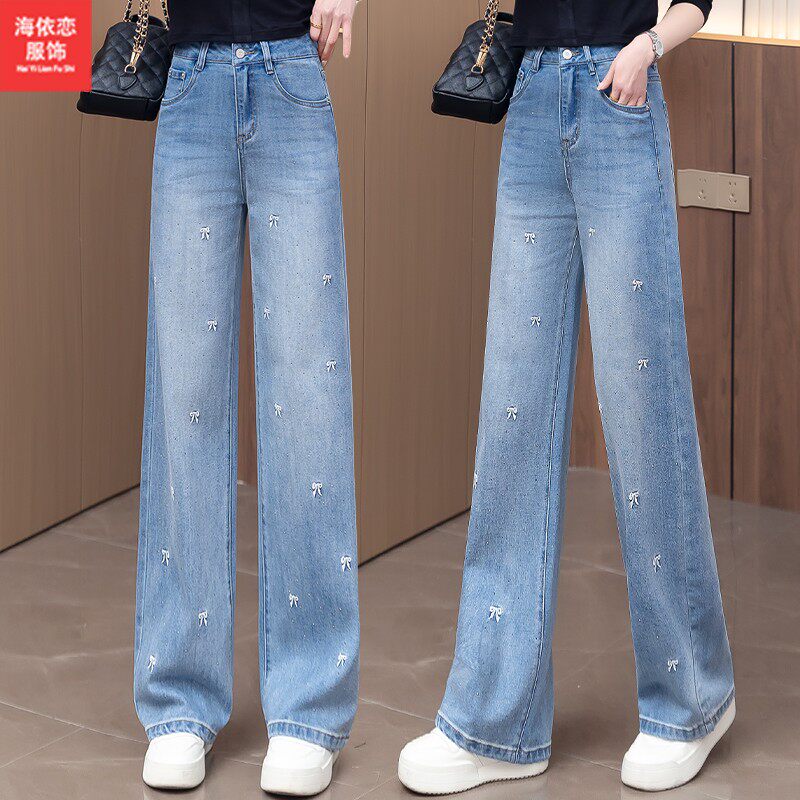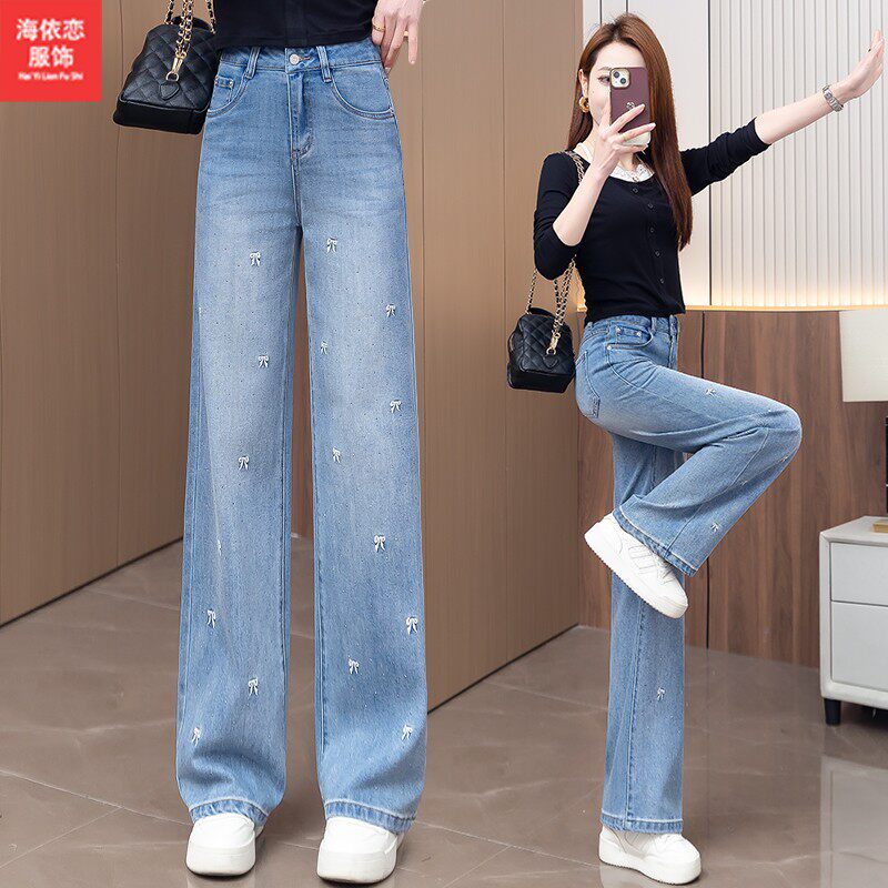 浅蓝色烫钻刺绣直筒牛仔裤女春秋季2026年新款高腰显瘦窄版阔腿裤