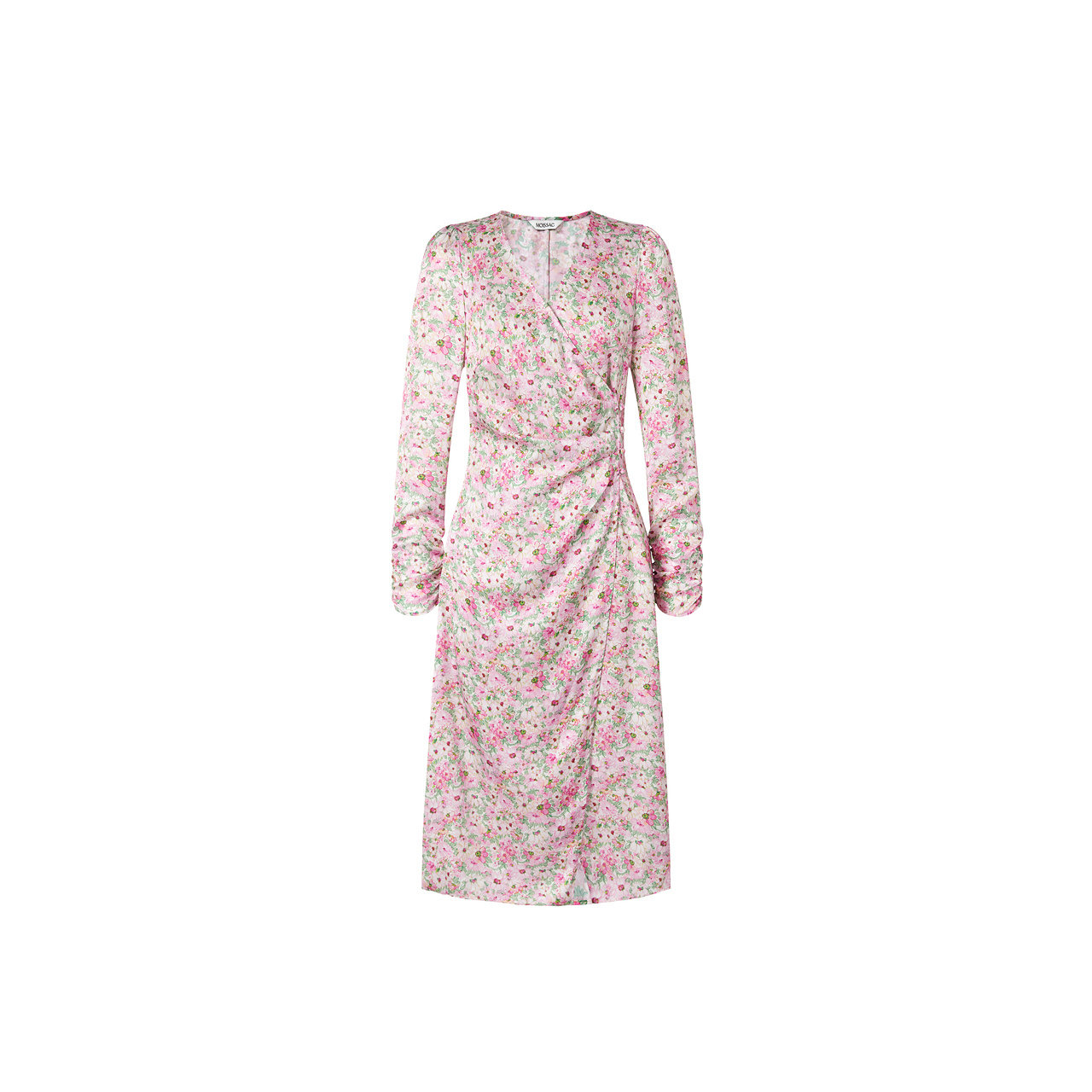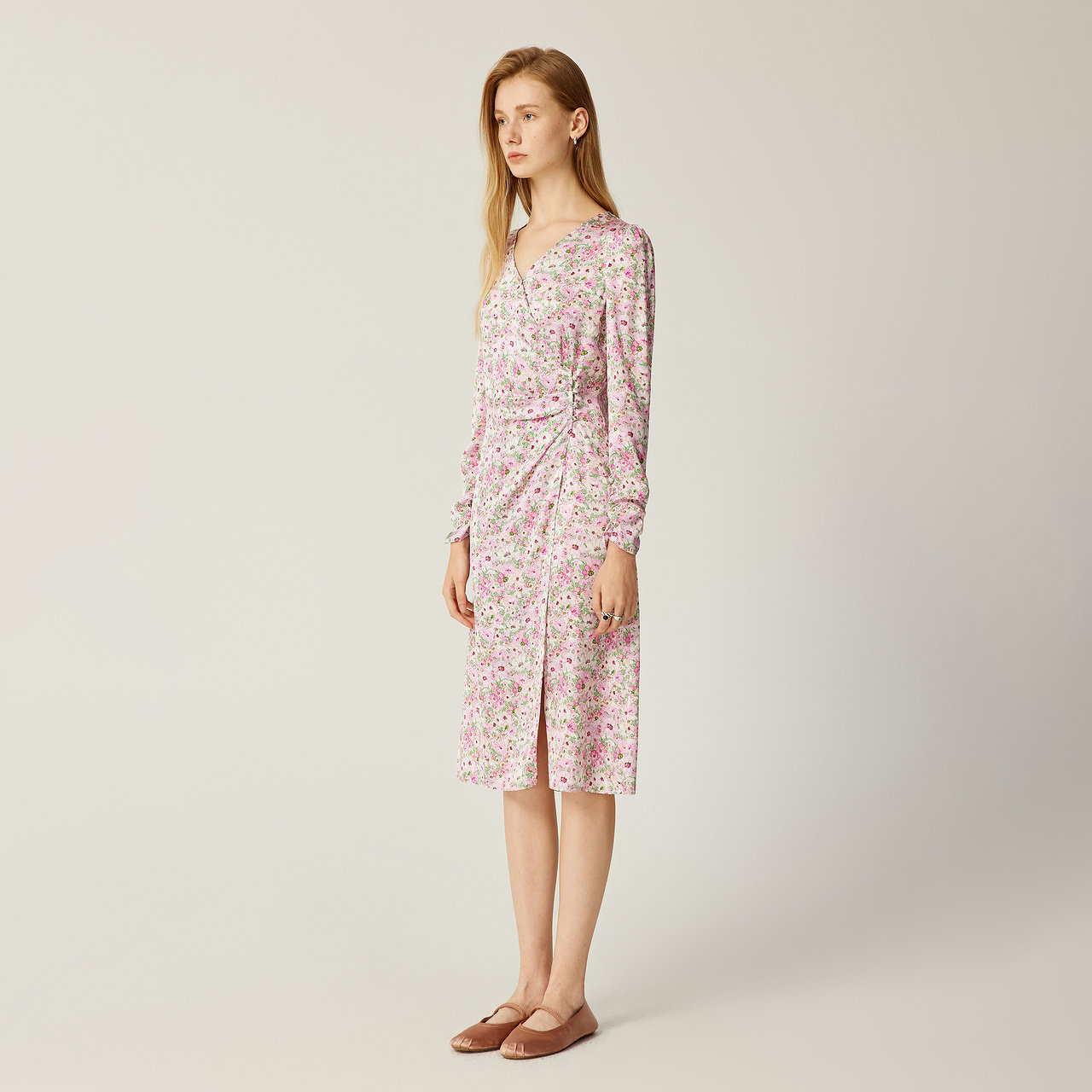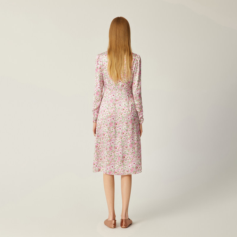 MOISSAC摩萨克春装侧开叉裙摆樱花粉碎花长款长袖连衣裙女