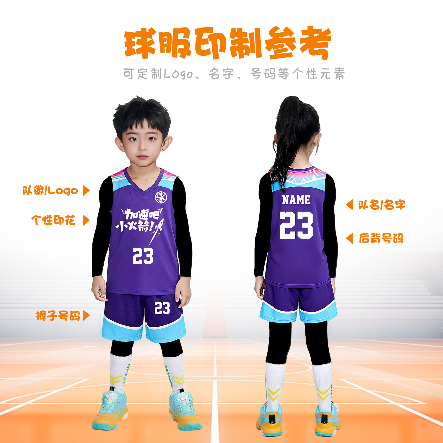 儿童篮球服套装秋冬紫色训练服定制男童打底紧身衣女孩四件套印字