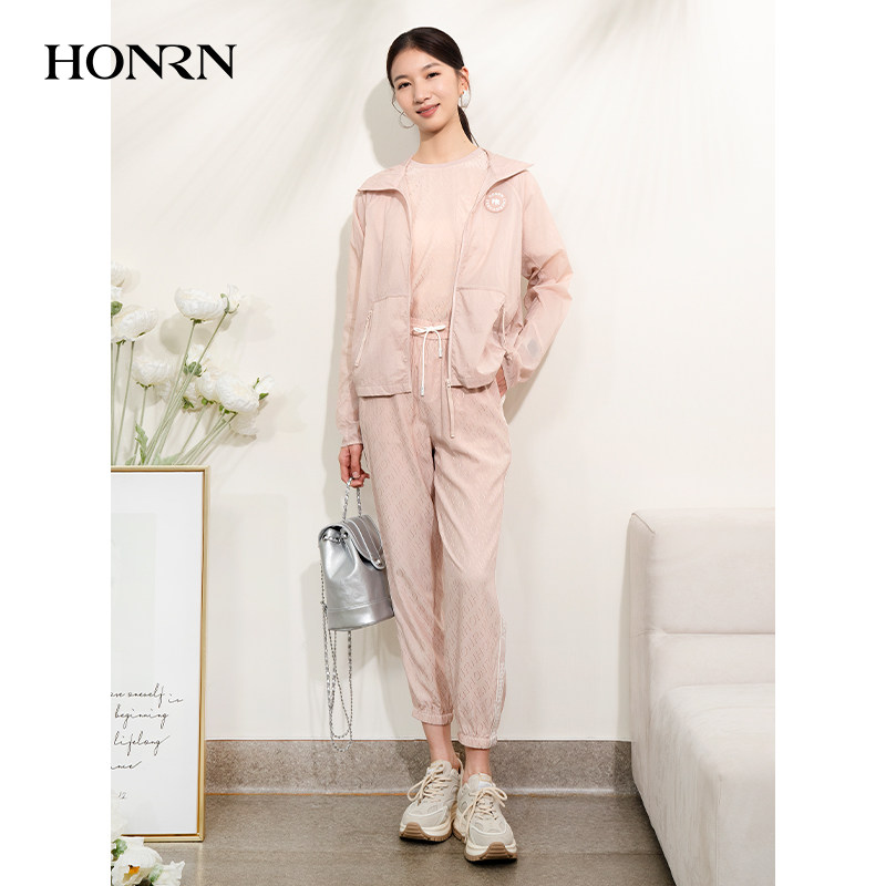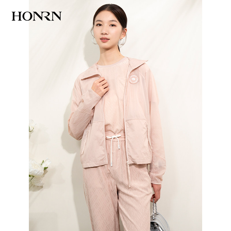 HONRN/红人运动休闲粉色连帽短款开衫外套上衣女款春夏HI22OS740