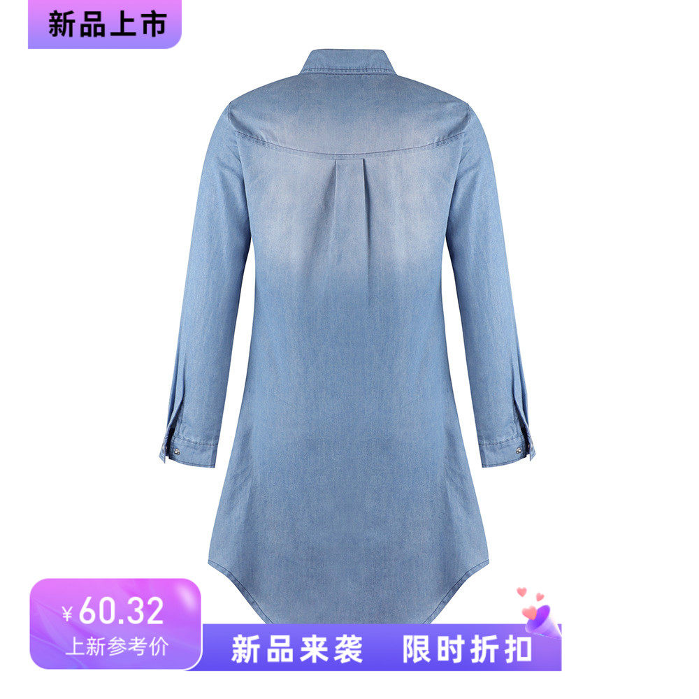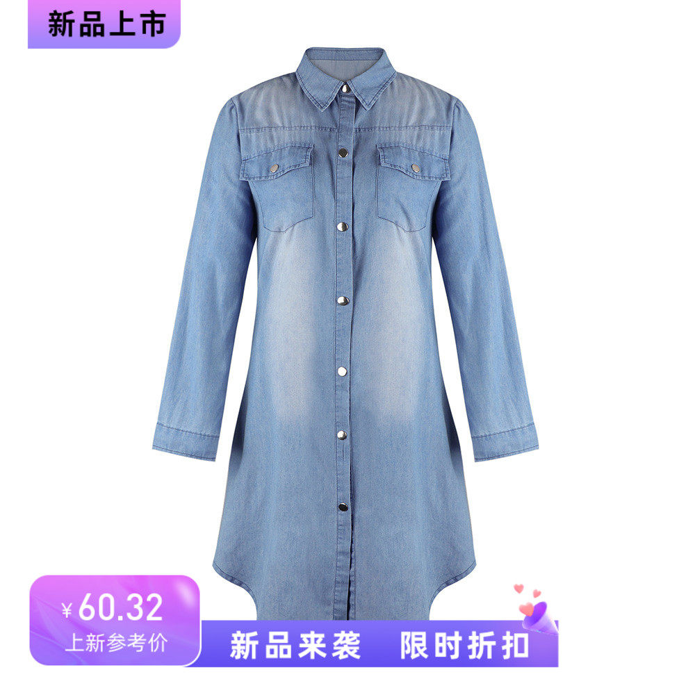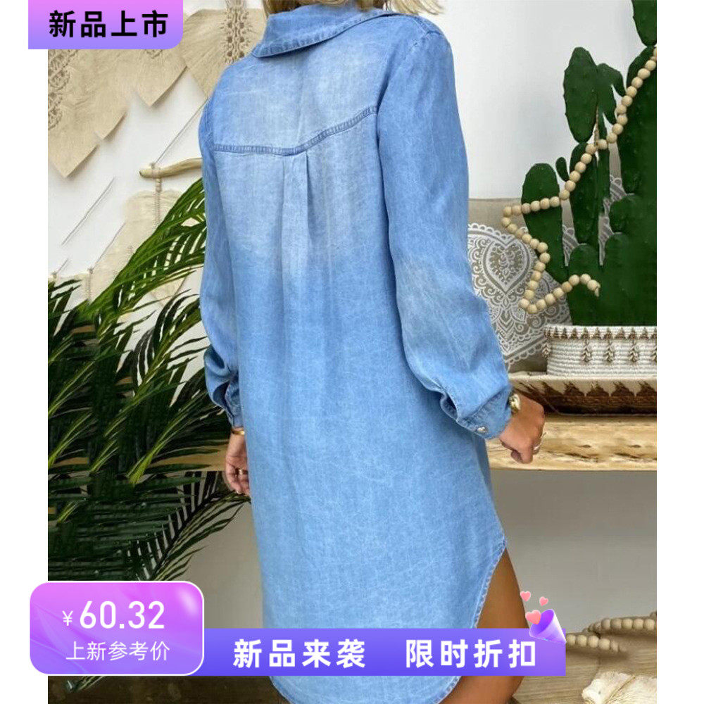 夏季新款POLO领单排扣蓝色宽松休闲长袖牛仔衬衫连衣裙短款DRESS
