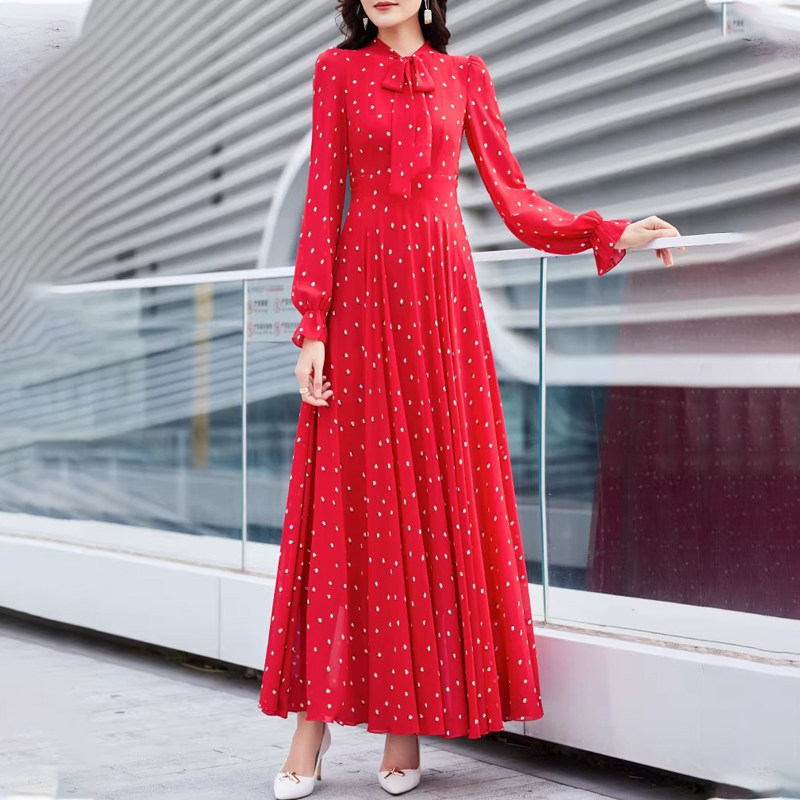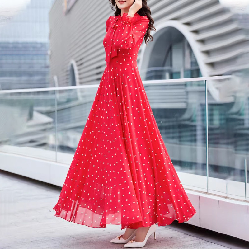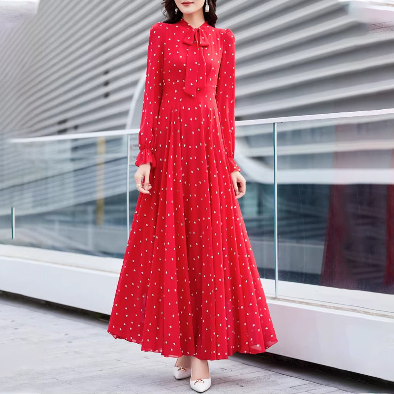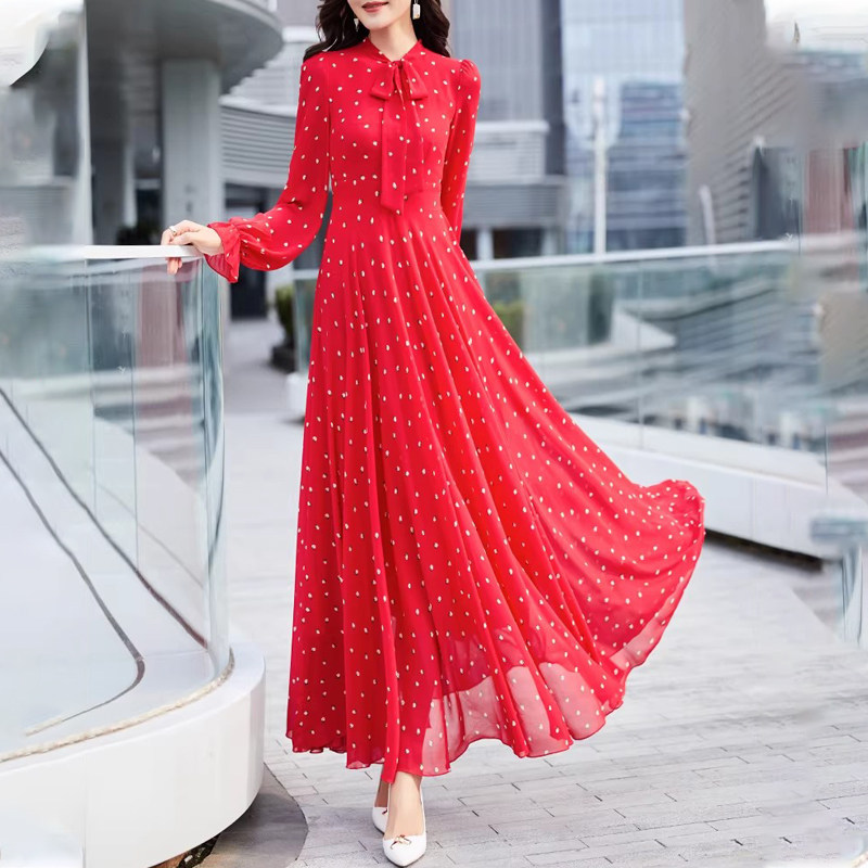 春夏超仙时尚海边度假印花系带真丝桑蚕丝连衣裙长袖修身大摆长裙