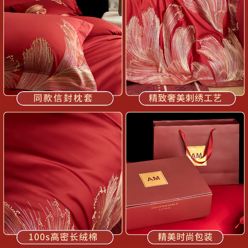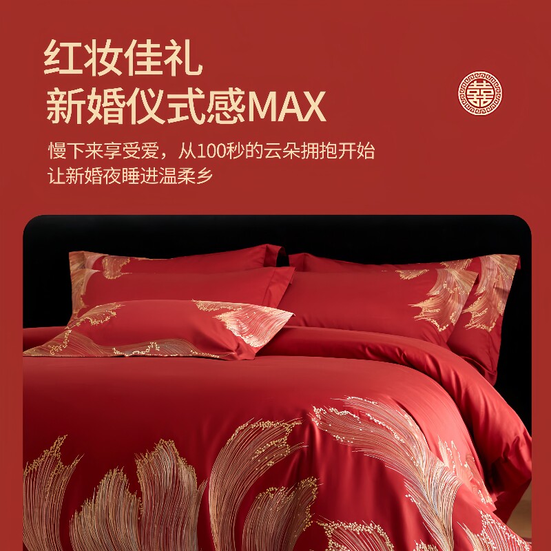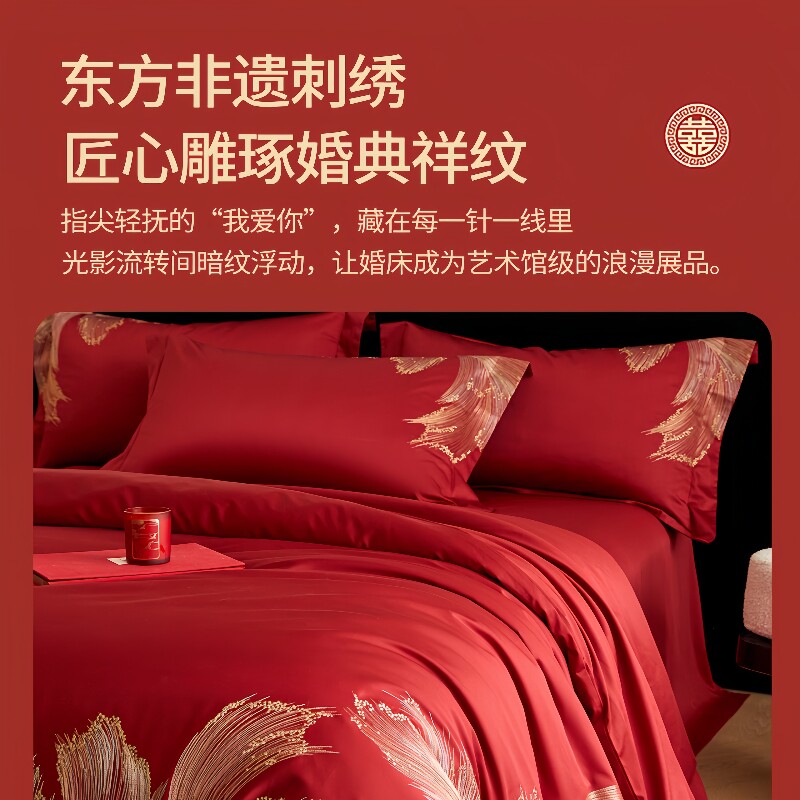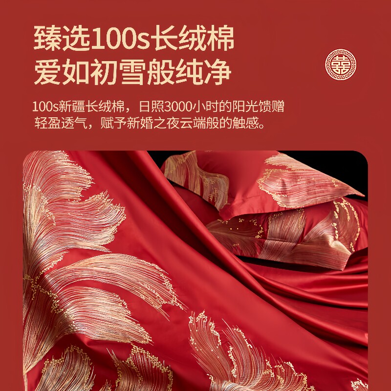 轻奢高级感红色四件套结婚床上用品100S全棉喜被婚庆简约高端婚嫁