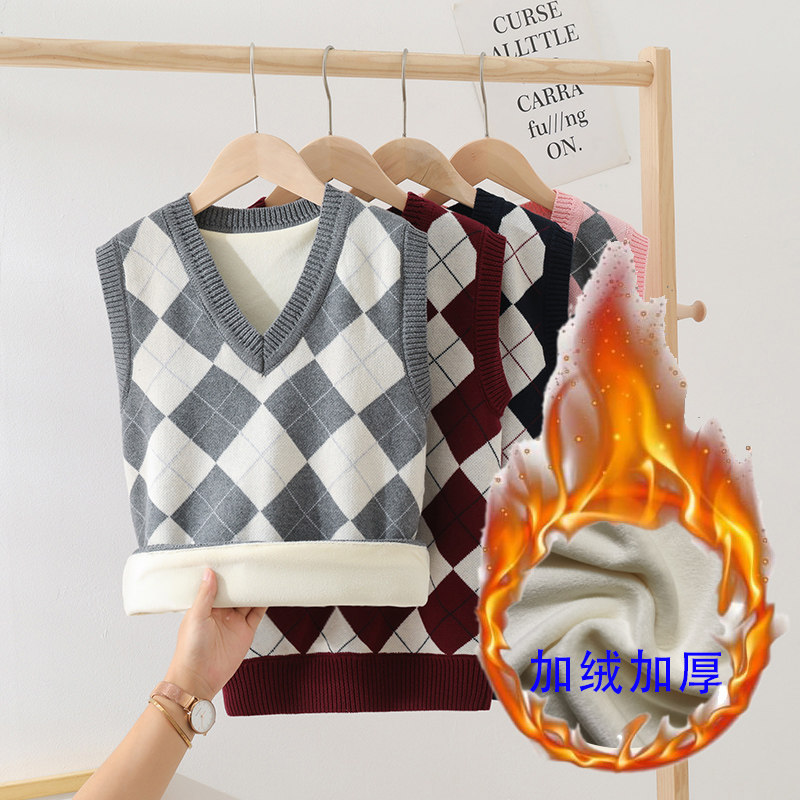女童马甲儿童格子灰色毛背心男童毛衣针织加绒毛线大童学院风马夹