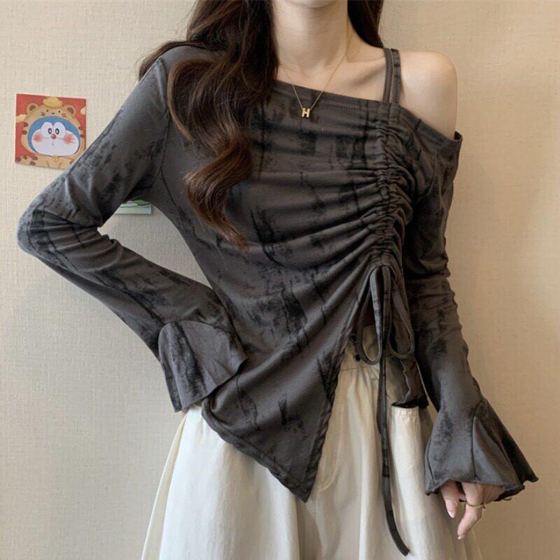 春装女款2026年新款爆款一字肩斜肩t恤抽绳喇叭长袖露肩短款上衣