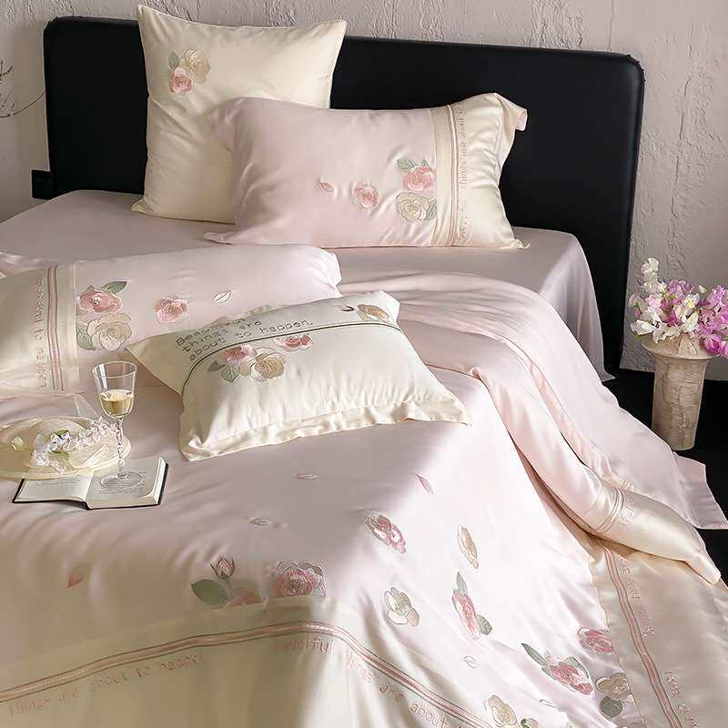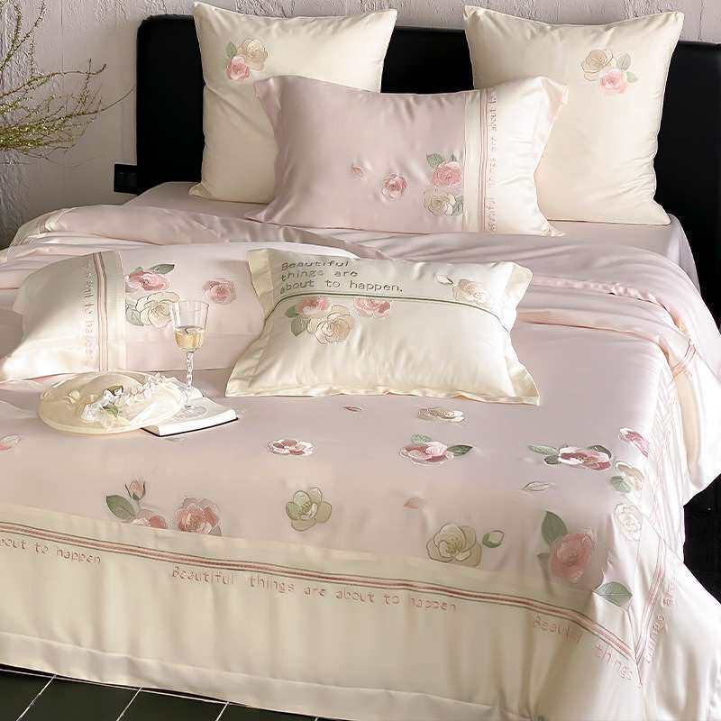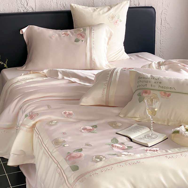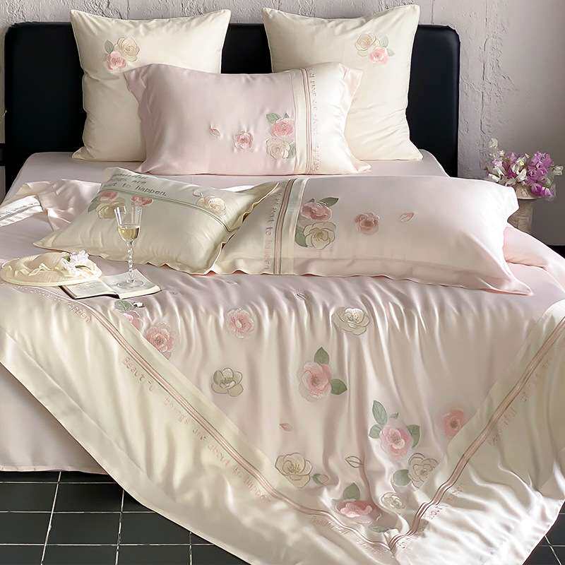 夏季少女心凉感冰丝四件套冰丝刺绣被套罩床单公主风粉色床上用品