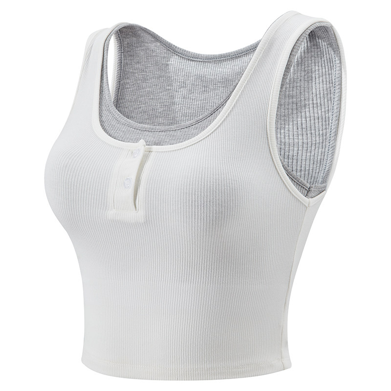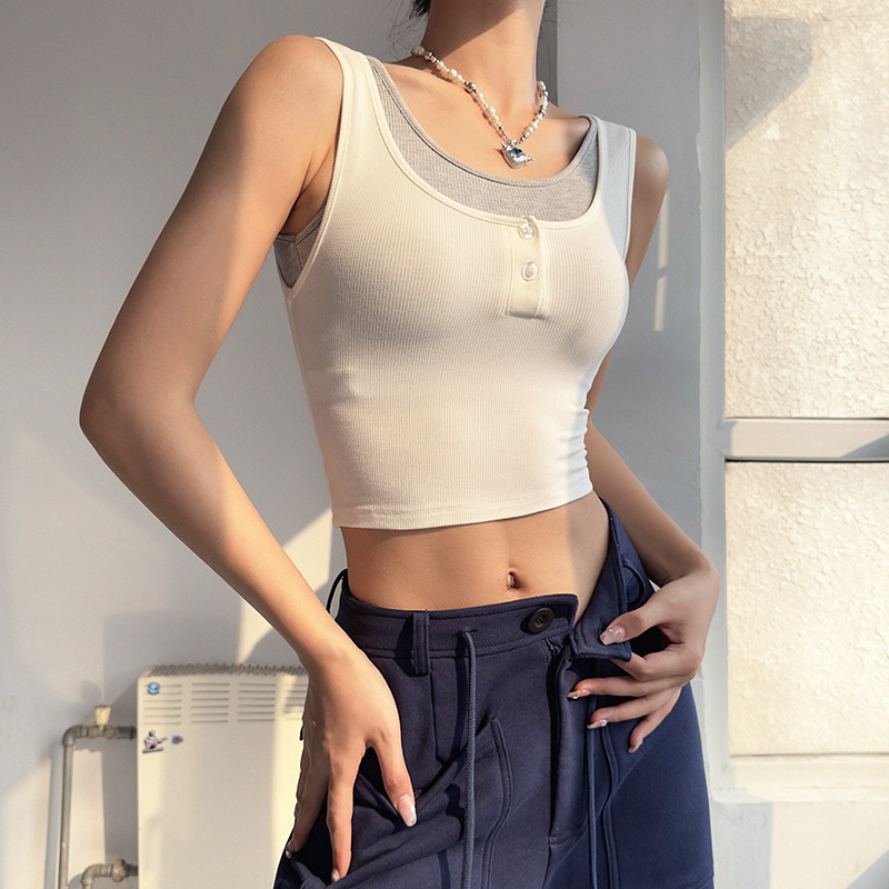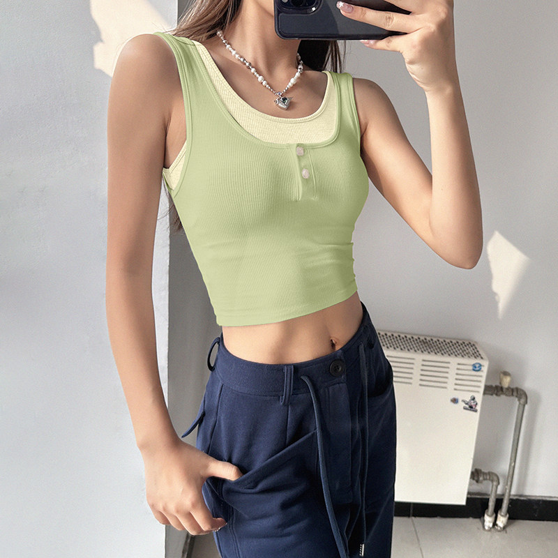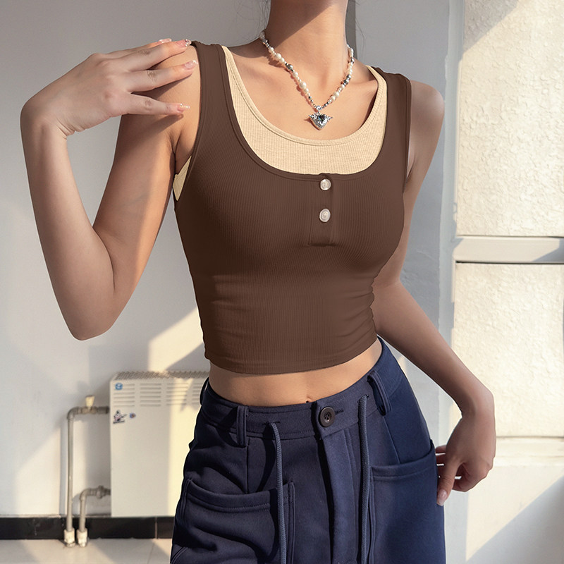 拼色假两件运动背心女含胸垫紧身瑜伽上衣弹力跑步健身服外穿T恤