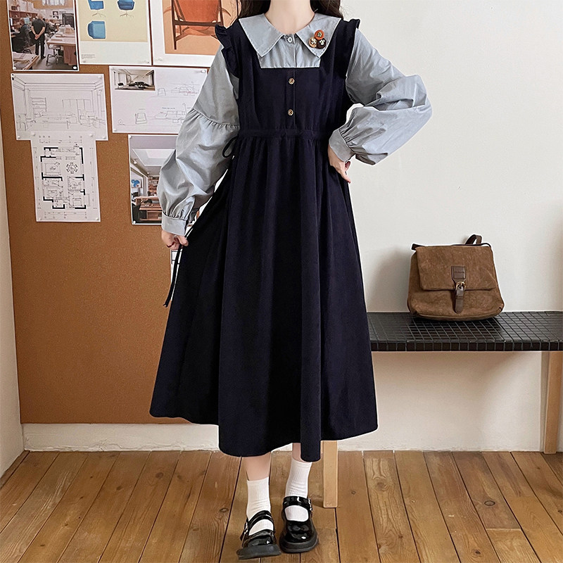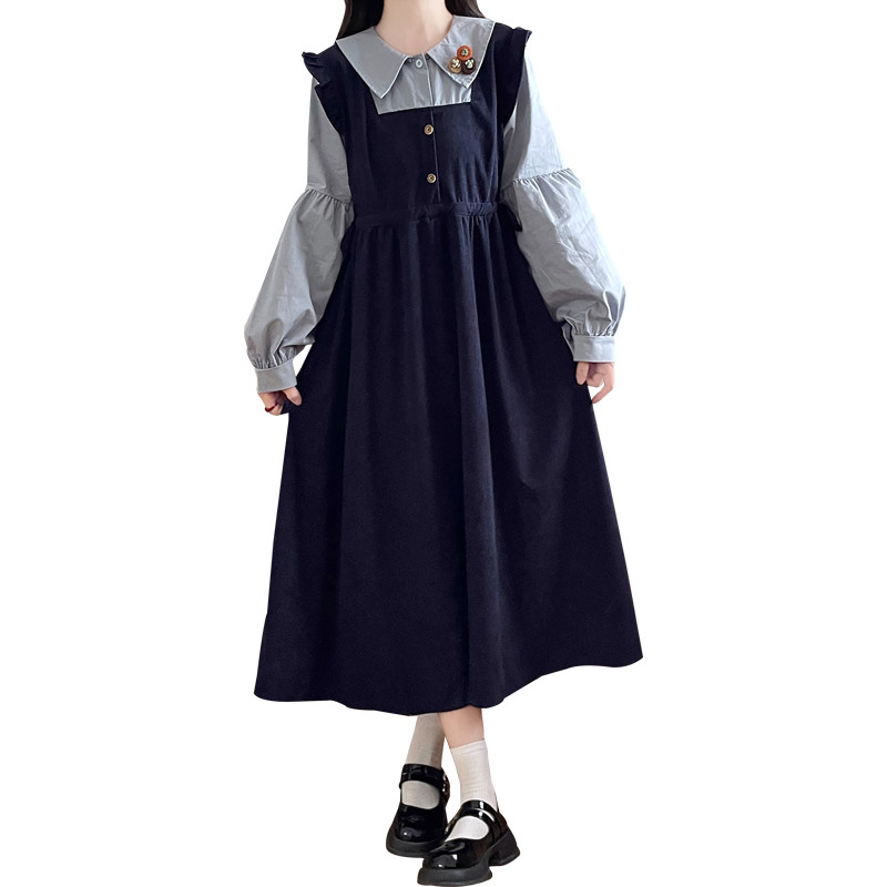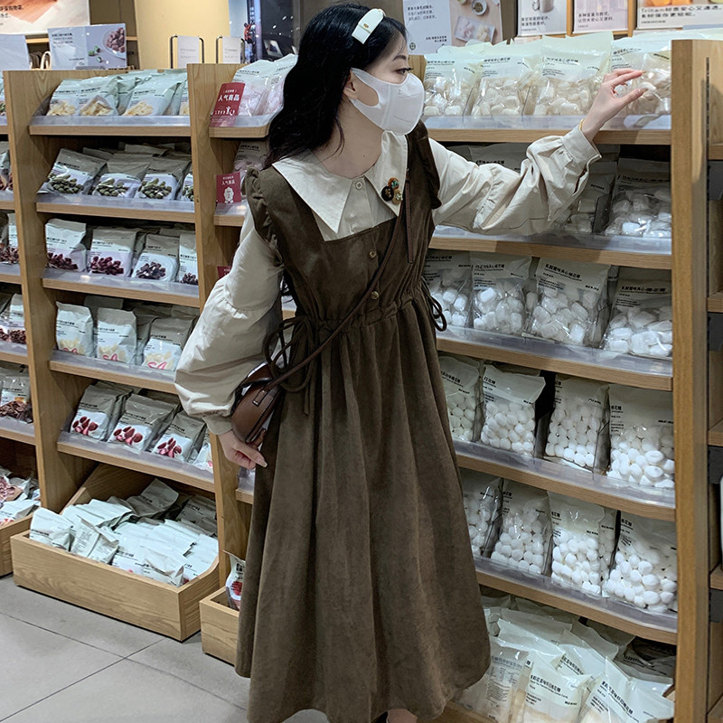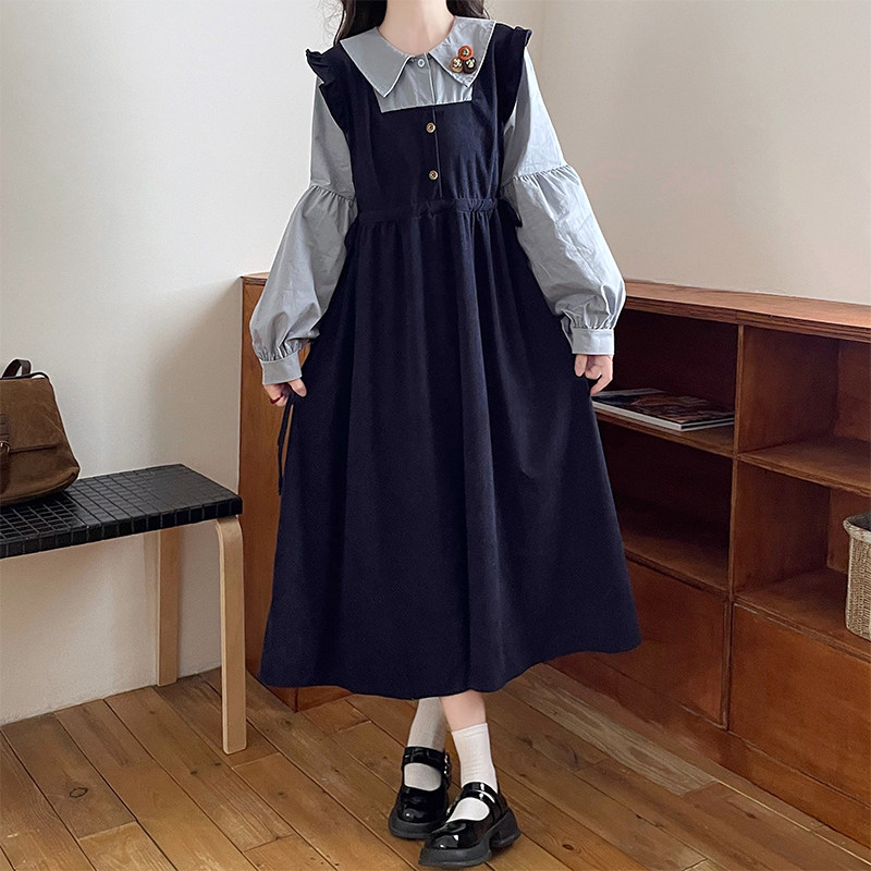 初中生假两件灯芯绒中长裙甜美少女高中学生秋冬学院风长袖连衣裙