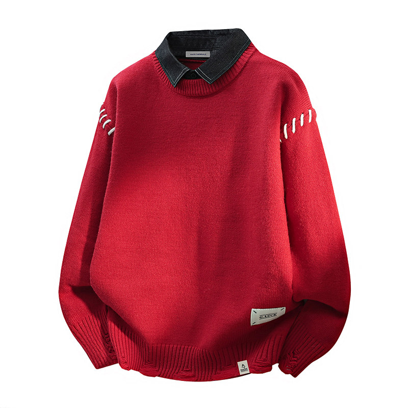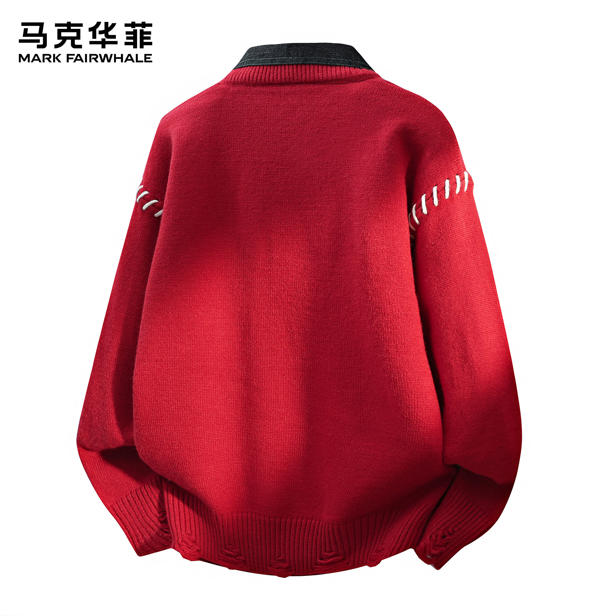 马克华菲毛衣男款潮流本命年红色假两件解构设计感翻领宽松针织衫
