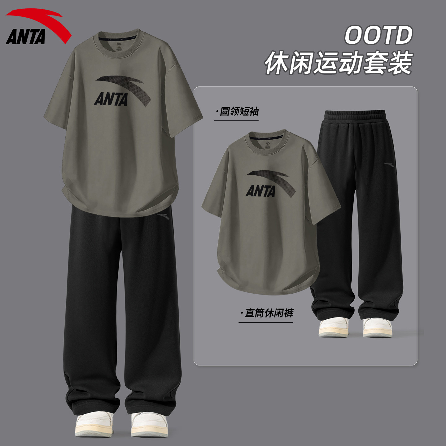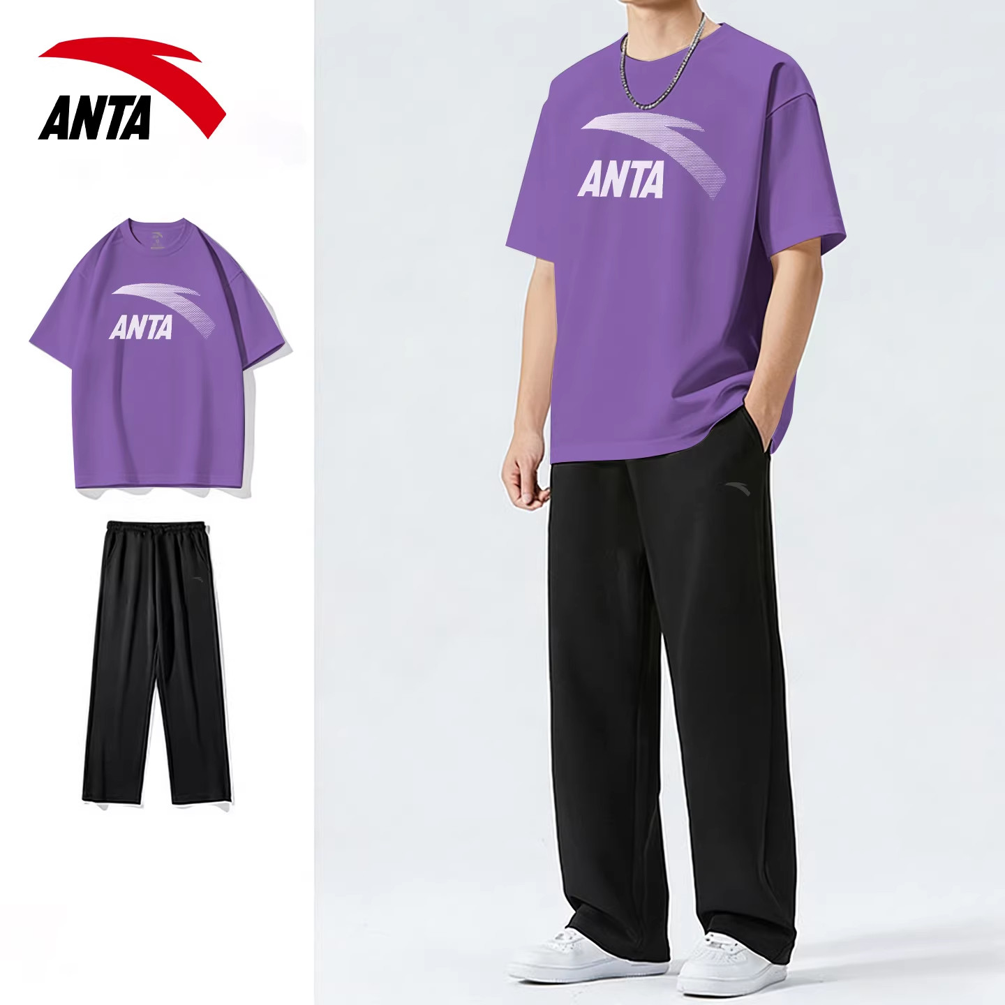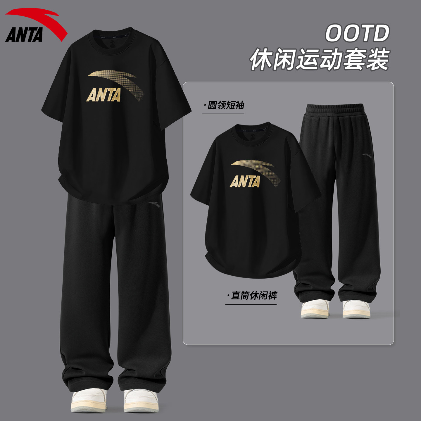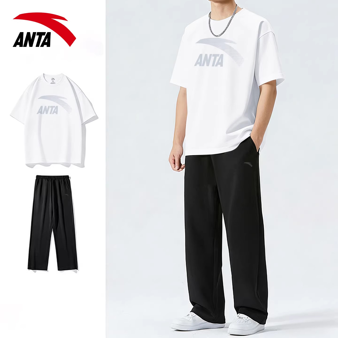 安踏运动套装男夏季青少年休闲潮流宽松大码跑步薄款透气短袖长裤