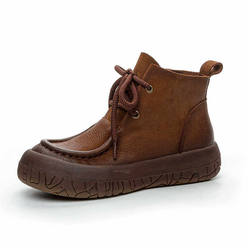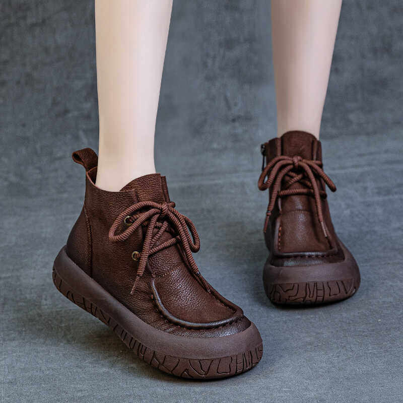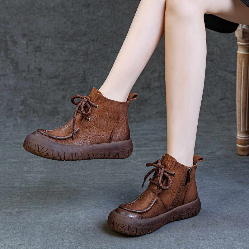 厚底松糕鞋短靴女圆头复古头层牛皮马丁靴百搭休闲真皮系带妈妈鞋