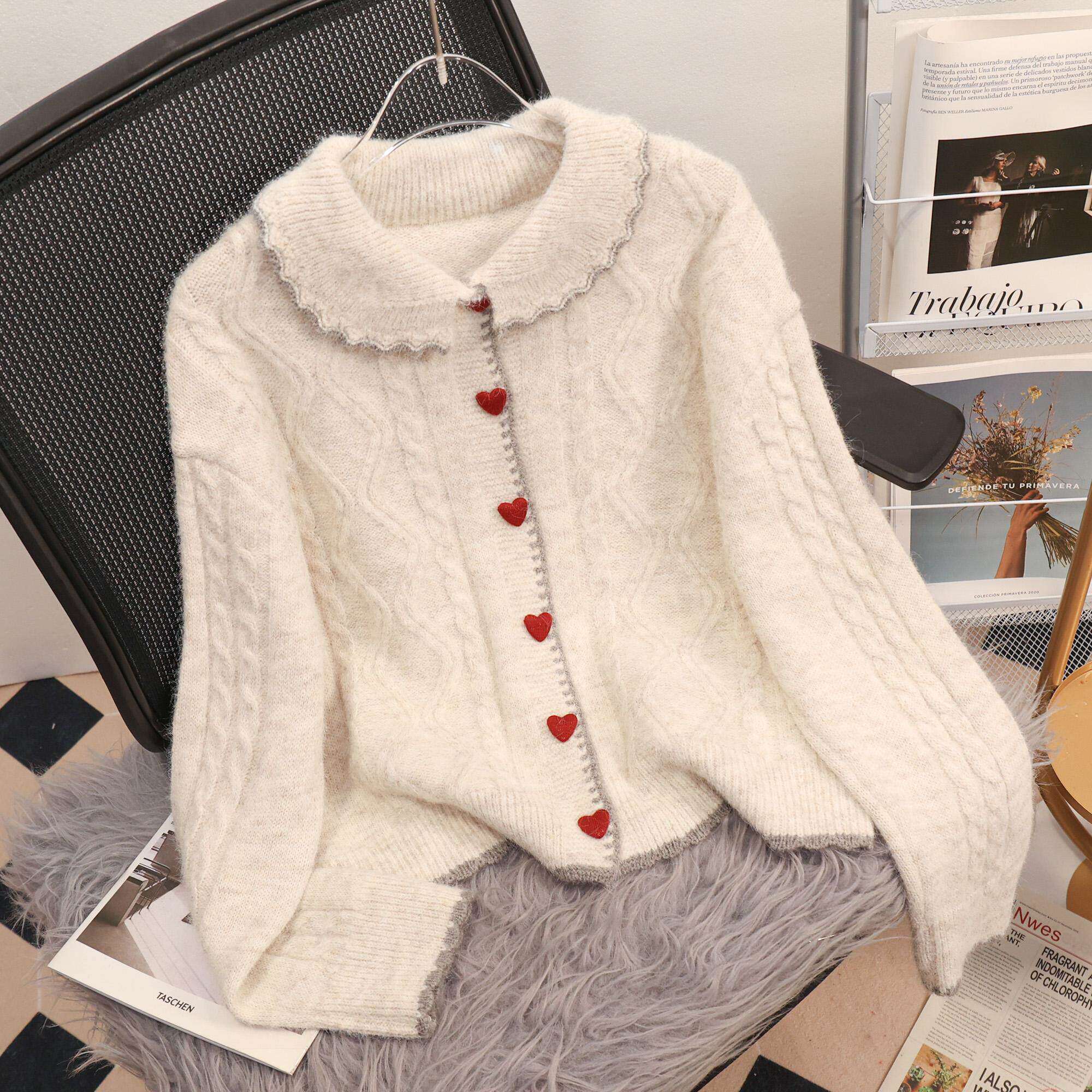 初中生女春装学生少女娃娃领爱心扣针织开衫短款毛衣上衣外套15岁