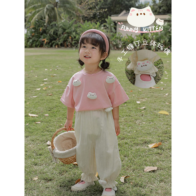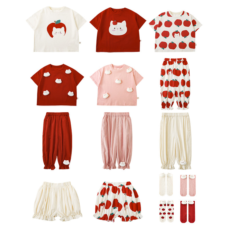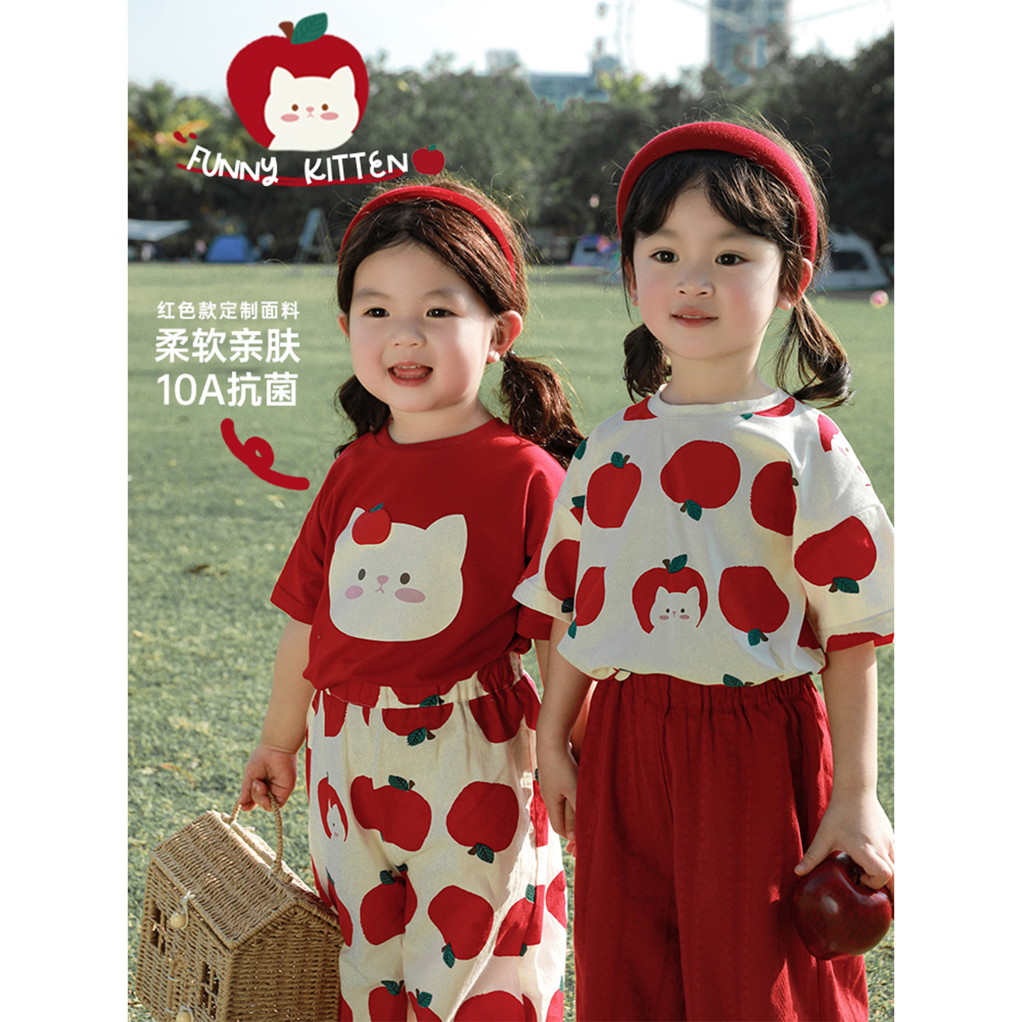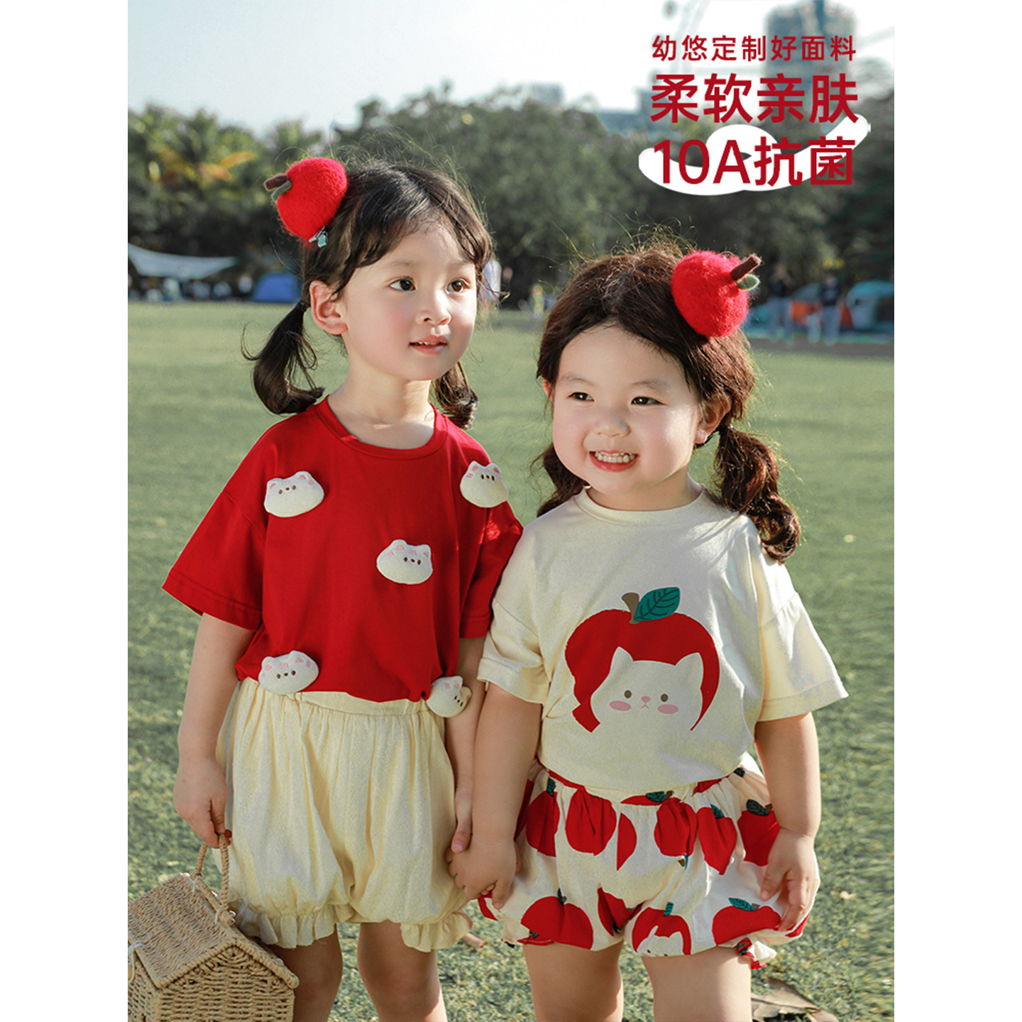 幼悠 女童苹果系列夏季短袖宝宝可爱满印束脚裤宽松百搭T恤套装潮