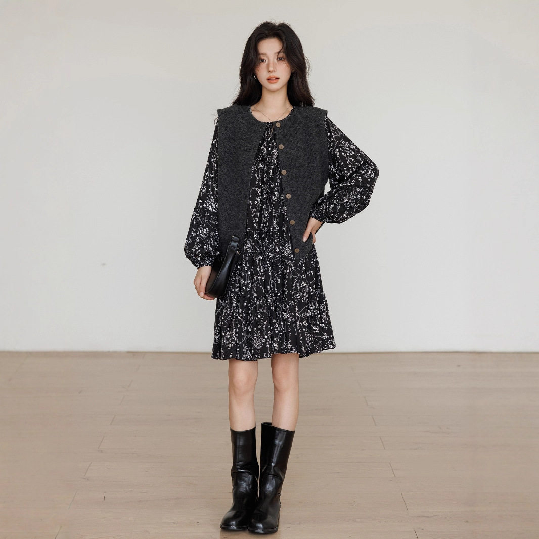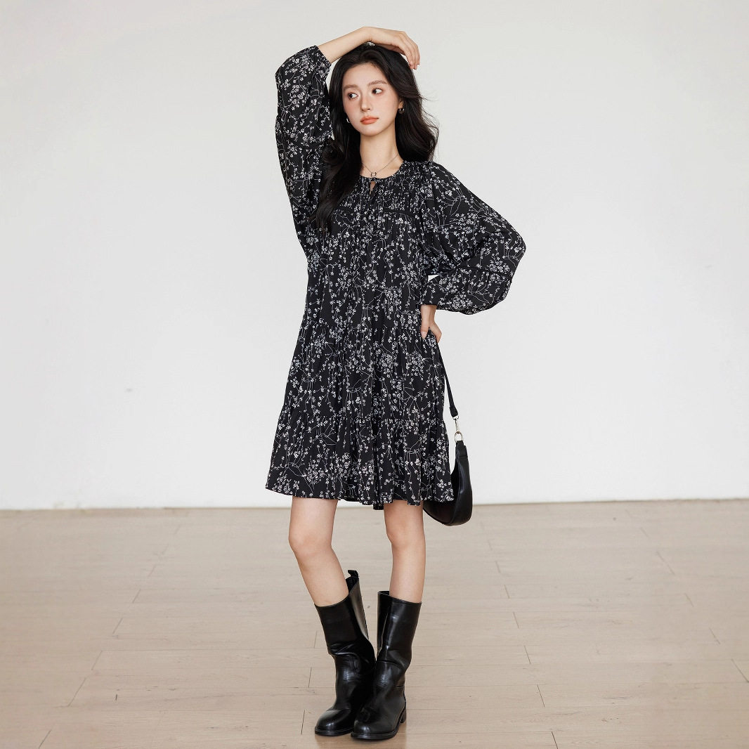 欧美碎花长袖连衣裙女春秋新款法式小个子桔梗裙收腰雪纺长裙