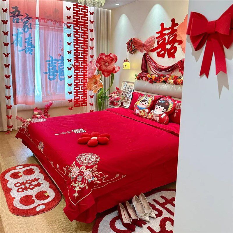 高档结婚四件套纯棉全棉2024新款床单大红色被套婚庆喜被床上用品