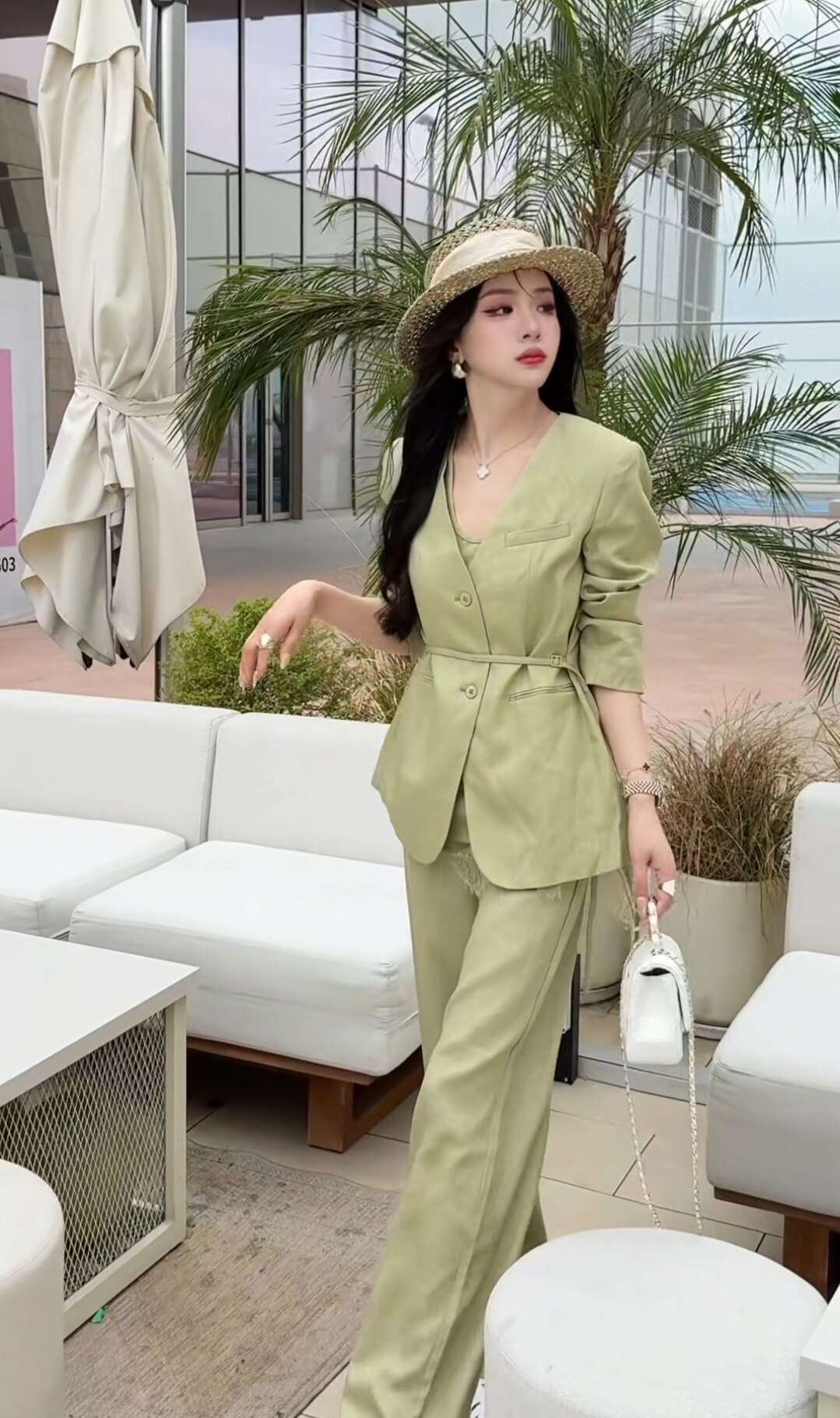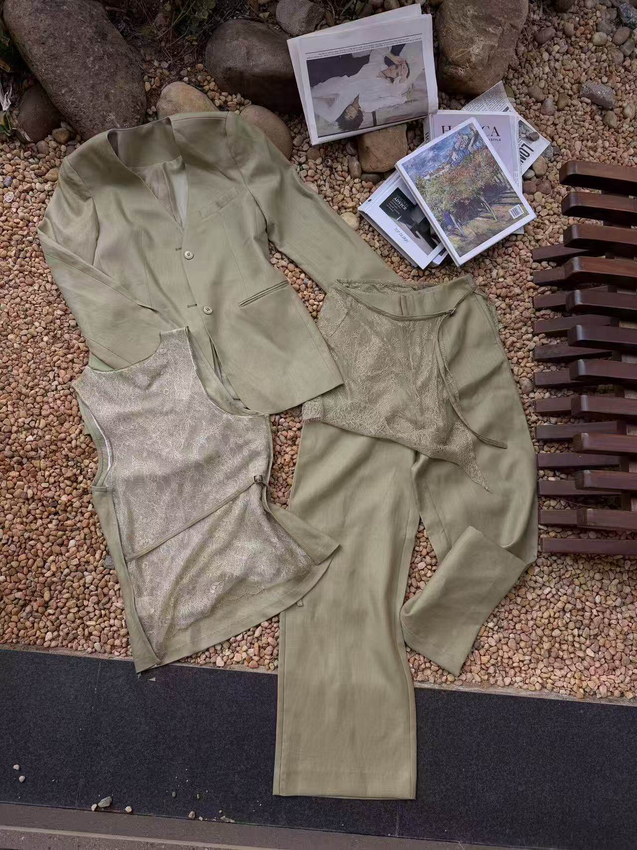 欧洲站2026春季新款V+.com高级感西装外套蕾丝内搭屁帘阔腿裤套装