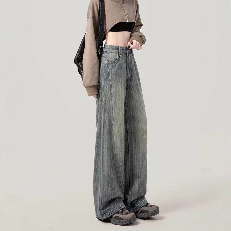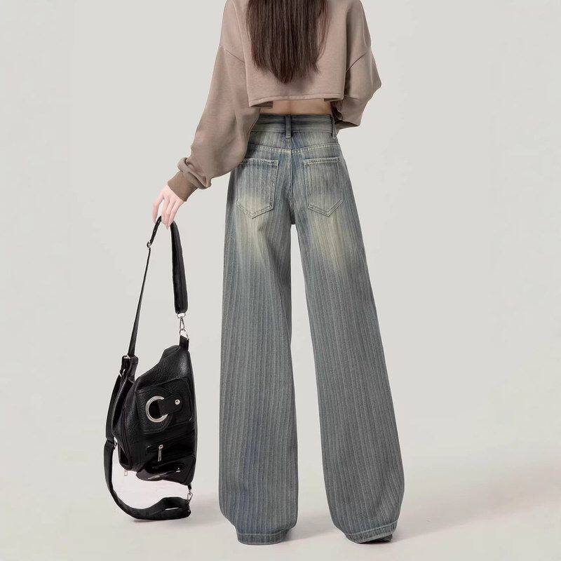 2026早春新款阔腿牛仔裤女高腰条纹宽松小个子慵懒显瘦直筒拖地裤