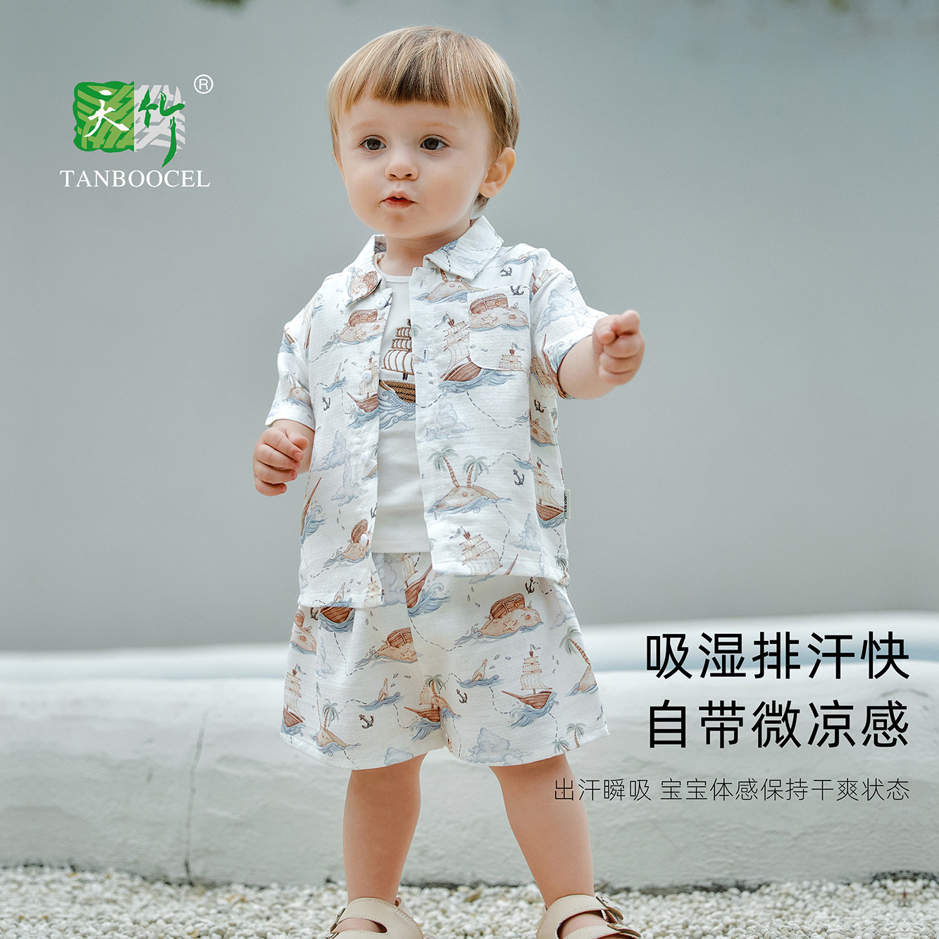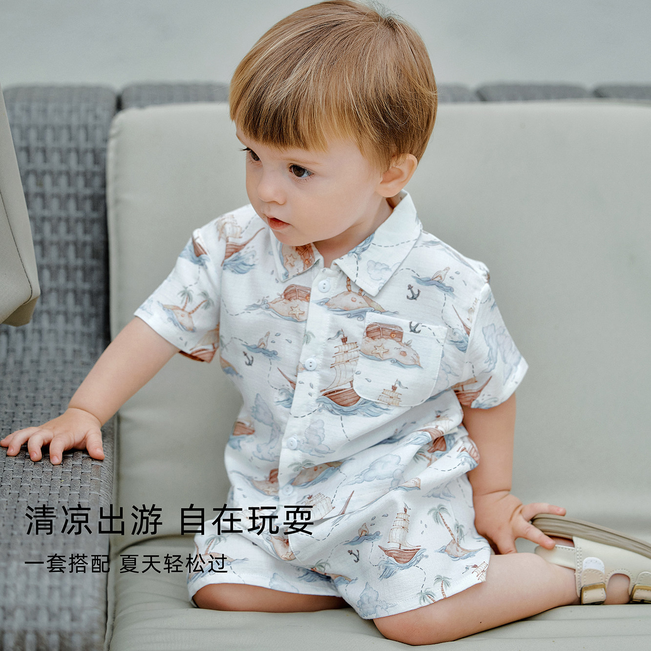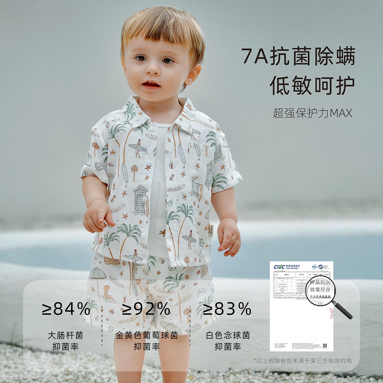 Elk Zoo男宝宝夏季分体套装薄款竹棉短袖衬衫短裤男童外出两件套