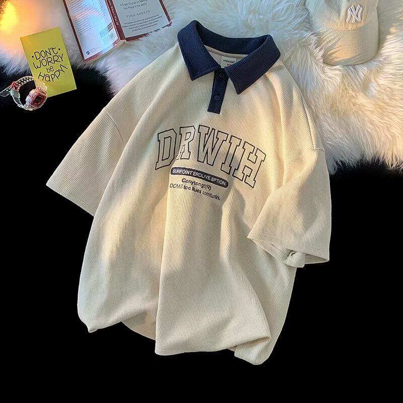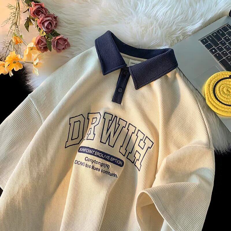 特大码300斤美式复古华夫格Polo衫男女夏季新款青少年翻领短袖T恤