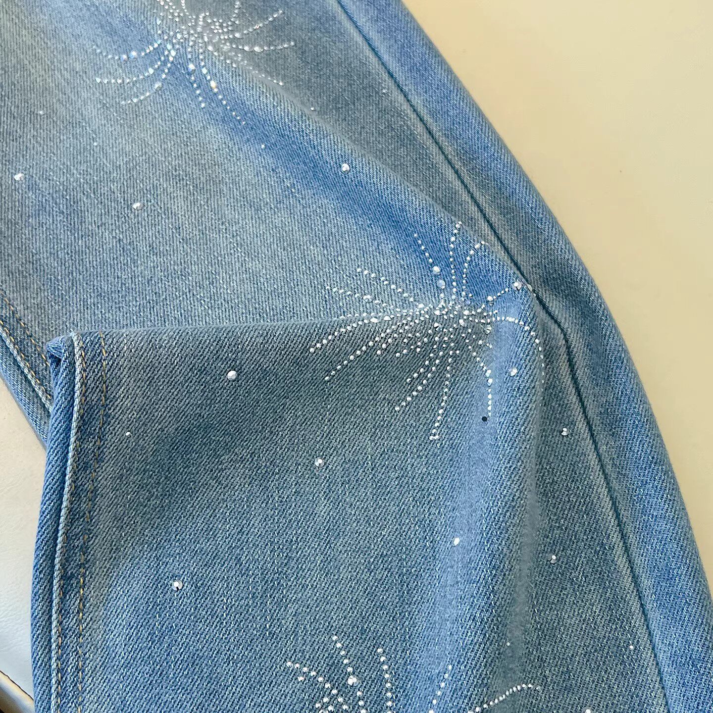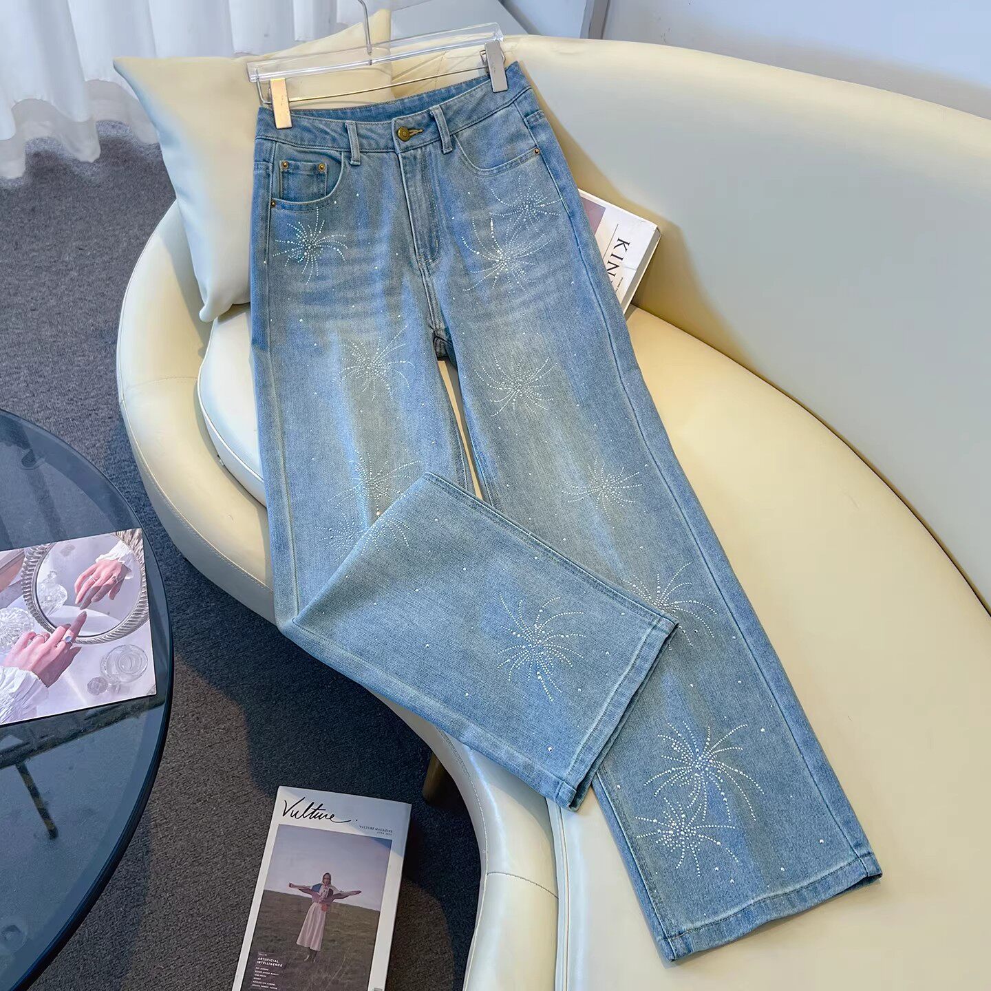 早春季浅蓝色裤子女款高腰烟花烫钻牛仔裤2026新款显瘦大码直筒裤