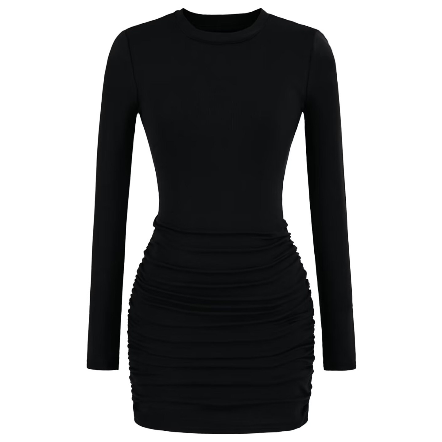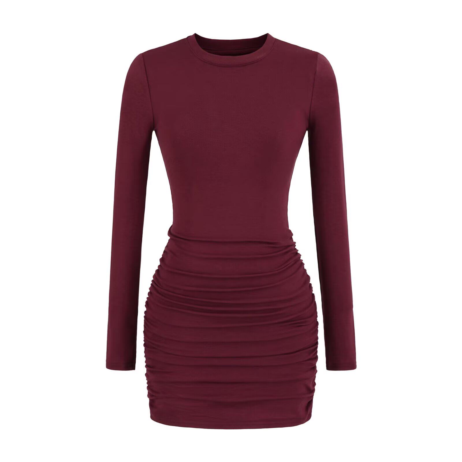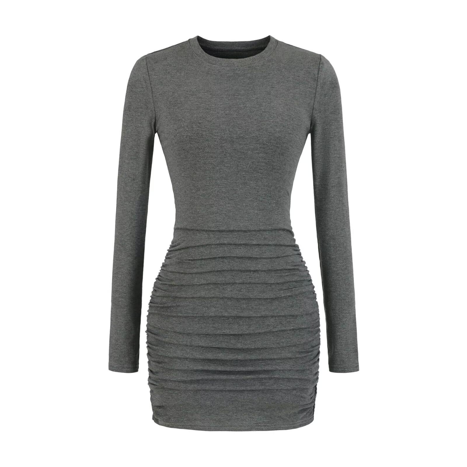 辣妹高弹美胯抽皱紧身包臀短裙女小个子修身显瘦长袖短款连衣裙