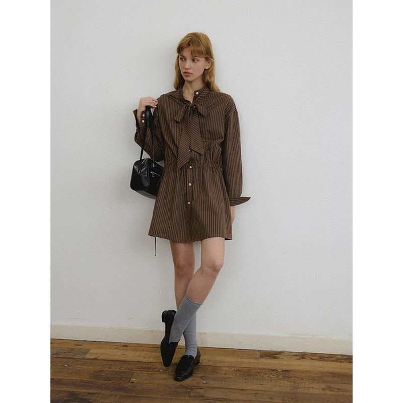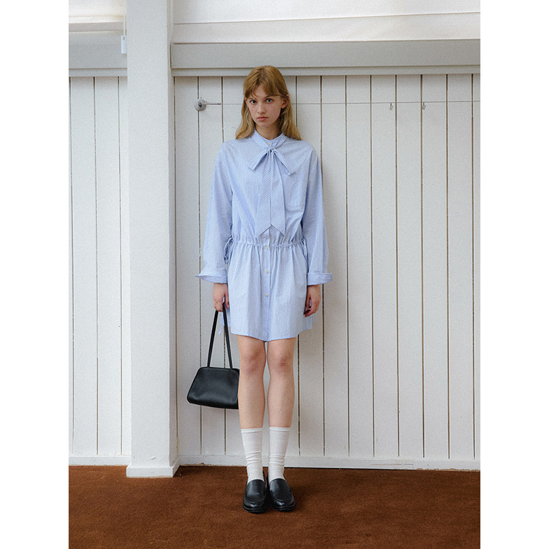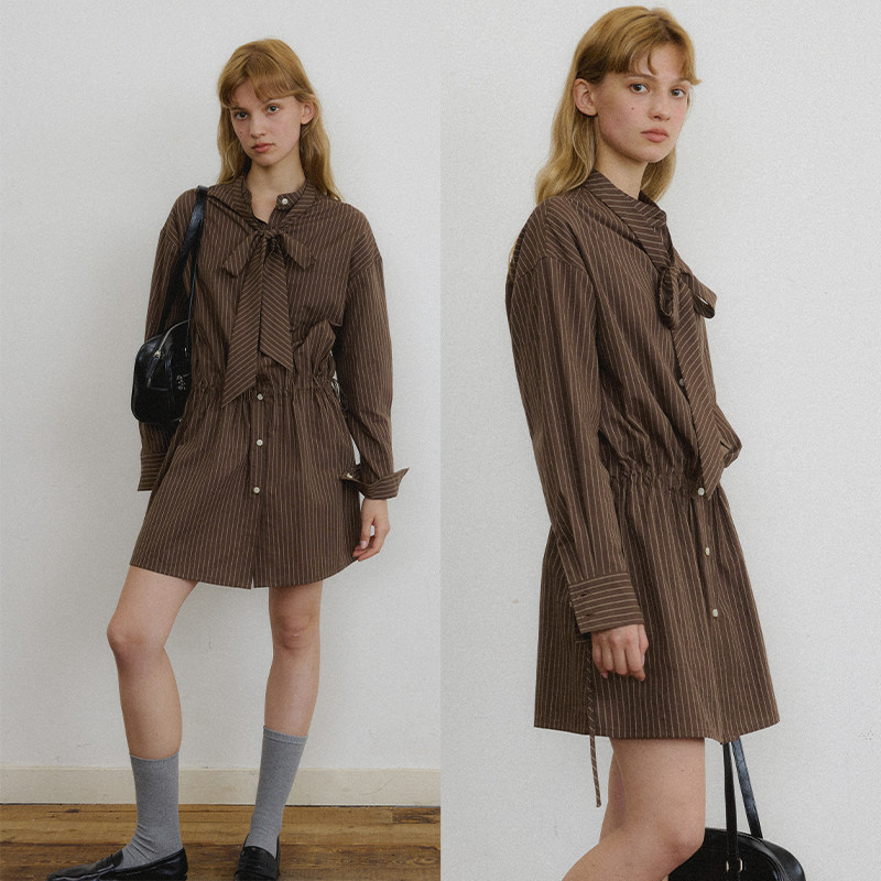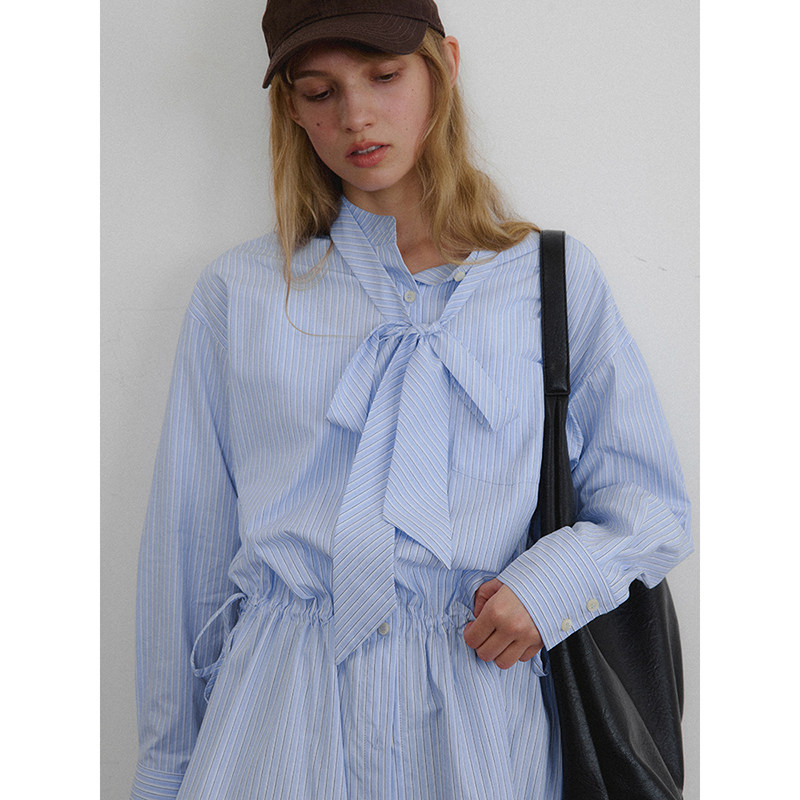 popchrio◆设计感两穿条纹长袖飘带衬衫裙小个子收腰短款连衣裙女
